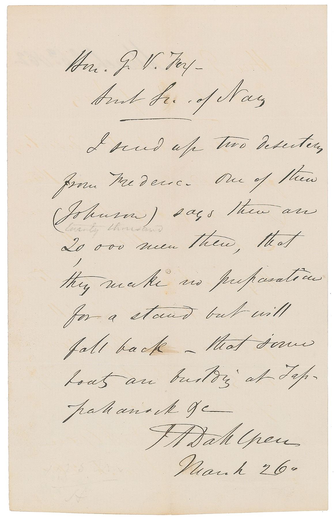 Naval leader (1809-1870) who headed the Union Navy's ordnance department during the Civil War and developed a number of guns and cannons. Civil War-dated ALS signed “J. A. Dahlgren,” one page, 5 x 7.75, March 26, 1862. Letter to Assistant Secretary of the Navy Gustavus Fox, in part: "I send up two deserters from Frederic. One of them (Johnson) says there are 20,000 men there, that they make no preparation for a stand but will fall back." In fine condition.