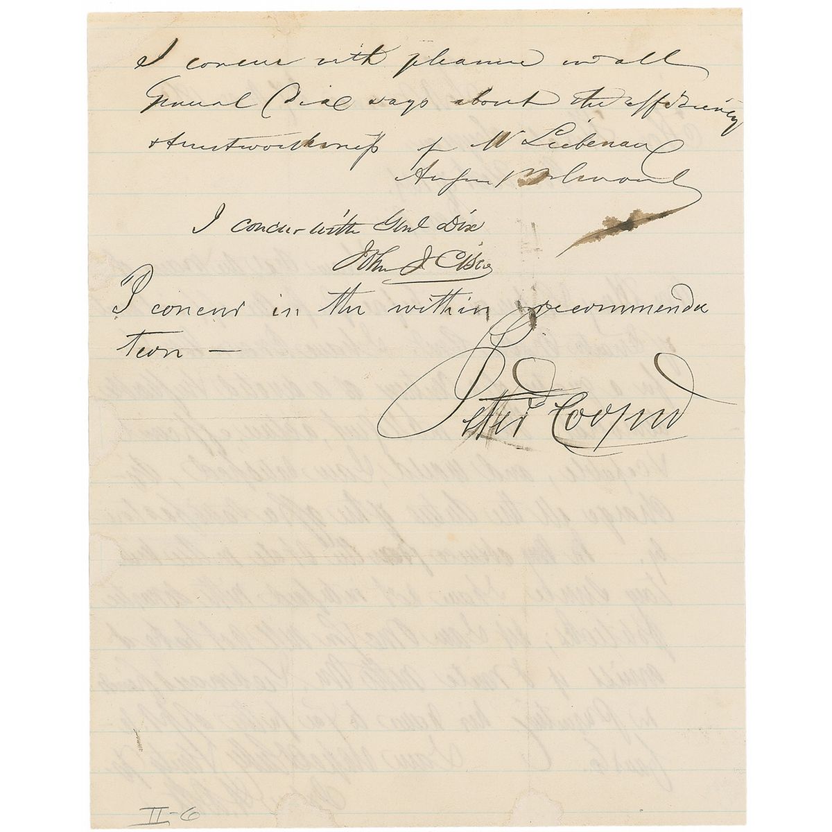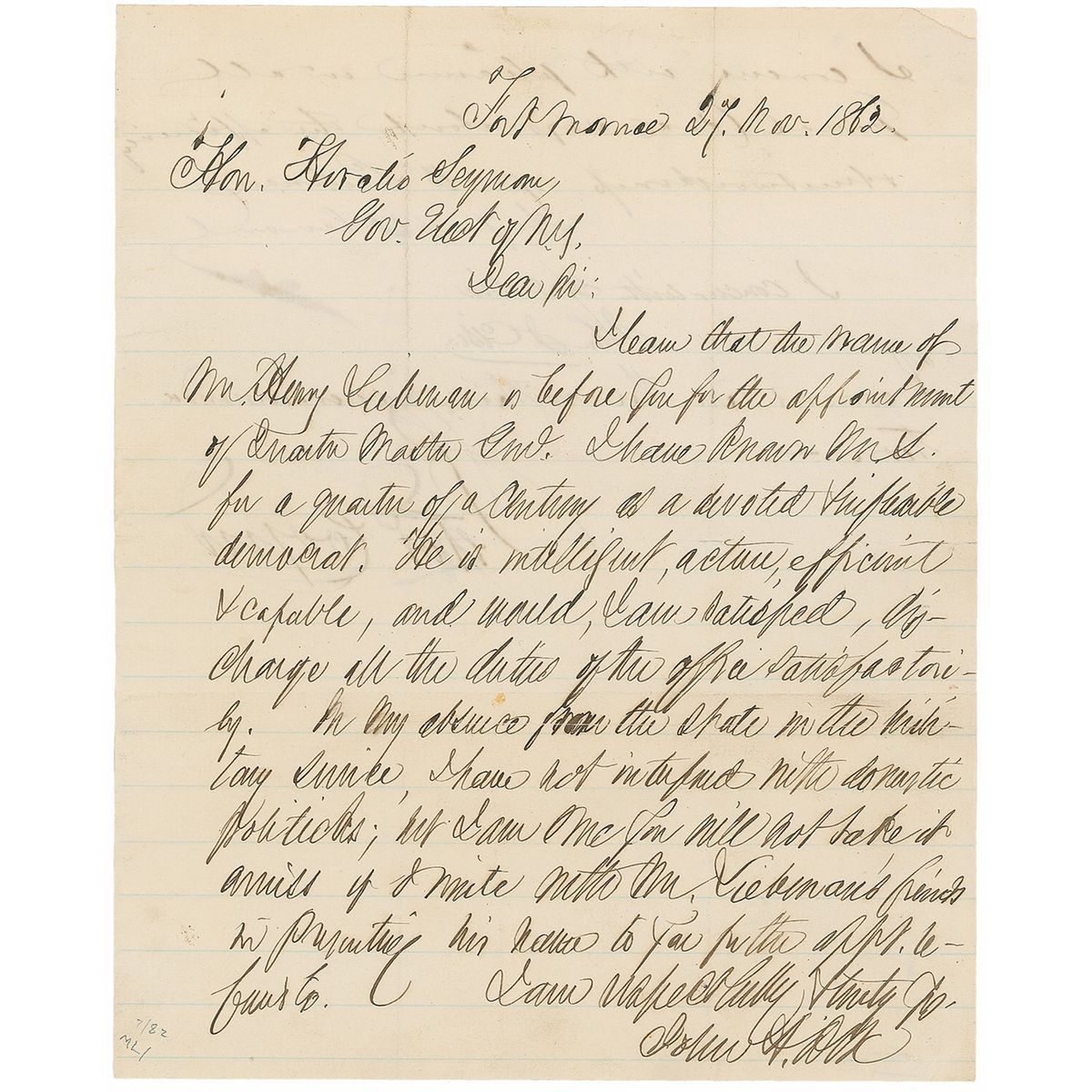 American military officer and politician (1798–1879) who served as a Union general during the Civil War, in which capacity he played a pivotal role in suppressing the New York Draft Riots in July 1863. His political and diplomatic career included posts as secretary of the treasury, minister to France, and governor of New York. Civil War–dated ALS, one page, 7.5 x 9.5, November 27, 1862. Letter to Horatio Seymour. In full: “I learn that the name of Mr. Henry Liebman is before you for the appointment of Quarter Master Gen’l. I have known Mr. S. for a quarter of a century as a devoted impeccable democrat. He is intelligent, active, & capable, and would, I am satisfied, discharge all the duties of the office satisfactorily. In my absence from the state in military service, I have not interfered with domestic politics; but I am sure you will not take it amiss if I write with Mr. Liebman’s friends in presenting his name to you for the appointment.” Endorsed on the reverse by three of said friends, prominent businessmen August Belmont, John Cisco, and Peter Cooper. Also includes a 2.25 x 4 full-length carte-de-visite photo of Dix by E. &. H. T. Anthony of New York, signed on the reverse in black ink, “John A. Dix.” Intersecting folds and some show-through from the endorsements on the reverse of the letter, otherwise overall fine condition.