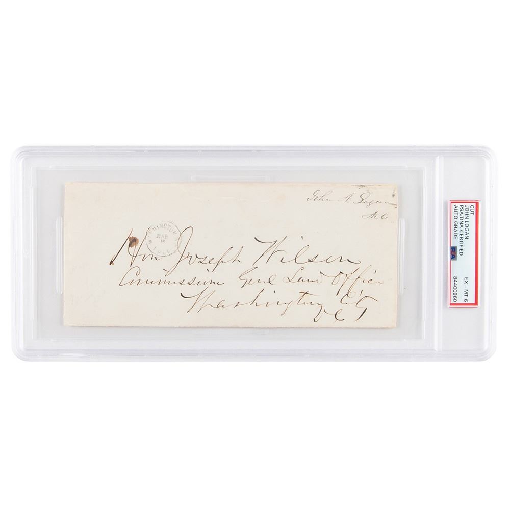 Hand-addressed envelope panel, 8.5 x 3.75, addressed in another hand to “Hon. Joseph Wilson, Commissioner Genl Land Office, Washington City, DC,†and franked in the upper right corner, “John A. Logan, AG.†In fine condition. Encapsulated in a PSA/DNA authentication holder, grading the autograph as "EX-MT 6."