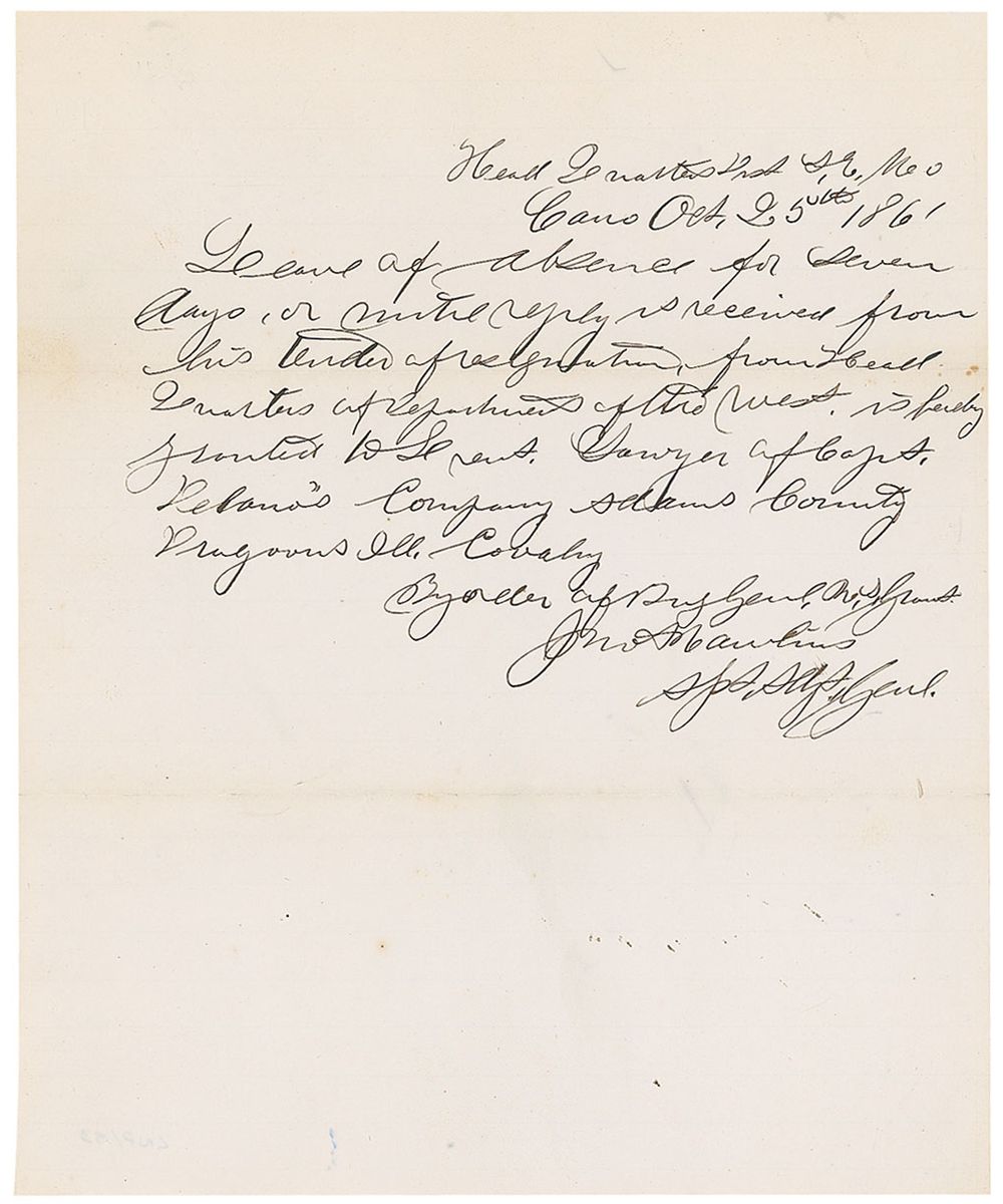 Union general (1831–1869). When the Civil War broke out, U. S. Grant asked Rawlins to be his aide de camp, and on Aug. 30, 1861, Rawlins was appointed assistant adjutant general on Grant's staff, and brigadier general on Aug. 11, 1863. During his brief life, Rawlins was Grant's alter ego and very intimate friend. He was one of the officers inside of the McLean house during Lee's surrender at Appomattox. When Grant became President of the US, he named Rawlins his secretary of war, a post he held for only five months before dying. War-dated ADS signed “Jno A. Rawlins,” one page, 8 x 9.75, October 25, 1861. Pass reads, in part: “Leave of absence for seven days, or until reply is received from his tenver of resignation from Headquarters…is hereby granted to Lieut. Sawyer of Capt. Delano’s Company…Dragoons, Ill. Cavalry.” In very good condition, with mild toning along horizontal fold through text, and some scattered light toning and creasing.