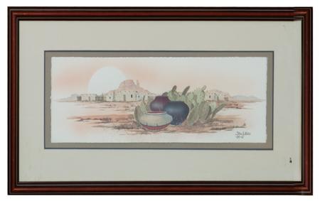 Signed original watercolor on pressed paper depicting a pueblo, pottery, and cacti. Condition: excellent. 7-1/2" x 22-1/2" (17" x 32)