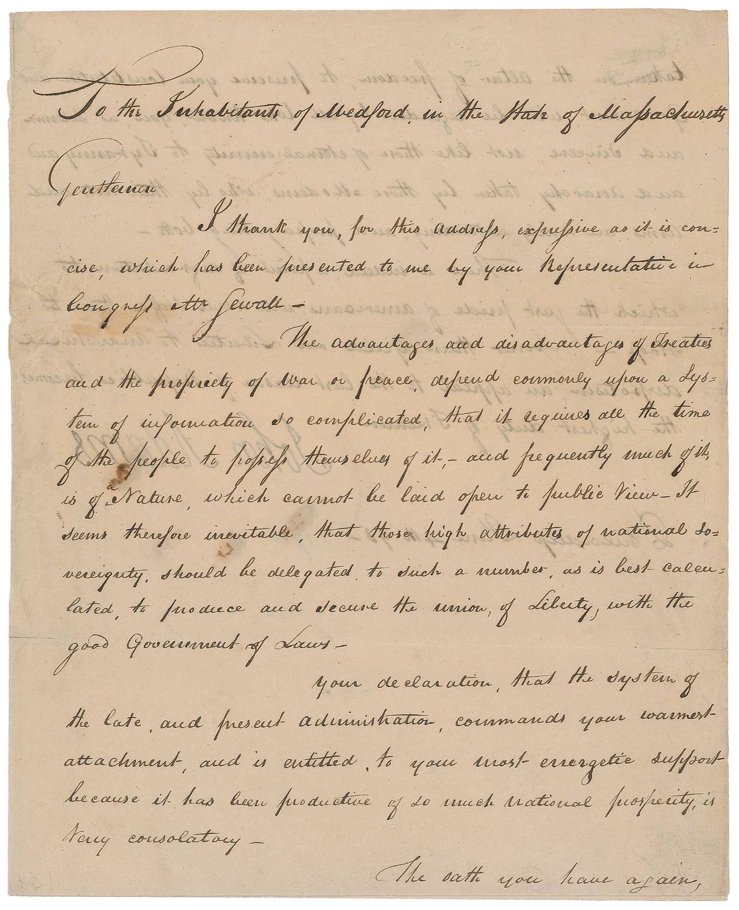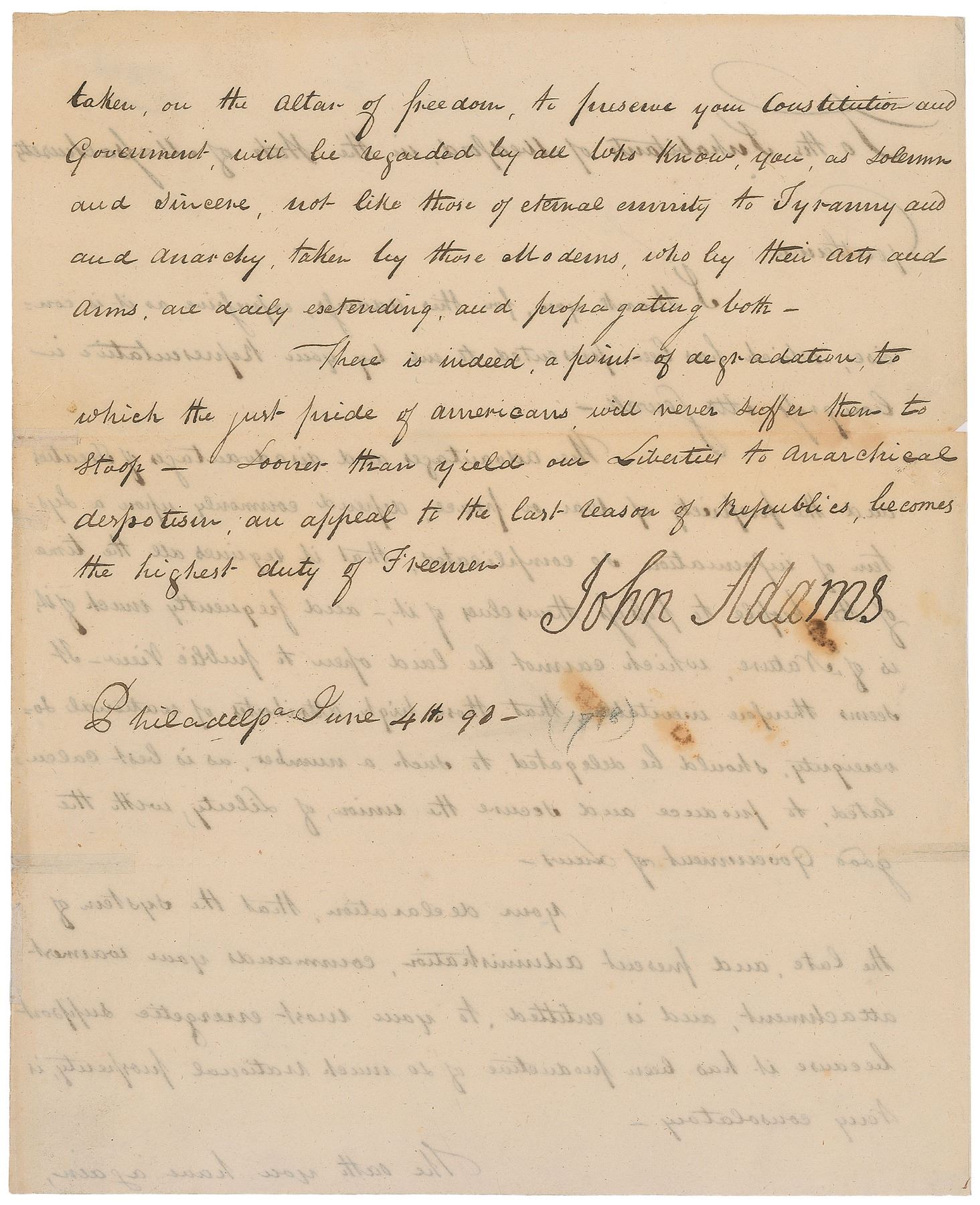 Letter signed as president, "John Adams," one page both sides, 8 x 9.75, June 4, 1798. Letter “To the Inhabitants of Medford in the State of Massachusetts.” In full: “Gentlemen. I thank you, for this address, expressive as it is concise, which has been presented to me by your Representative in Congress Mr. Sewall—The advantages and disadvantages of Treaties and the propriety of war or peace, depend commonly upon a System of information so complicated, that it requires all the time of the people to possess themselves of it,—and frequently much of it is of a Nature, which cannot be laid open to public view—It seems therefore inevitable, that those high attributes of national sovereignty, should be delegated to such a number, as is best calculated, to produce and secure the union, of Liberty, with the good Government of Laws—Your declaration, that the system of the late, and present administration, commands your warmest attachment, and is entitled, to your most energetic support because it has been productive of so much national prosperity, is very consolatory—The oath you have again, taken, on the altar of freedom, to preserve your Constitution and Government, will be regarded by all who know you as solemn and sincere, not like those of eternal enmity to Tyranny and anarchy, taken by those Moderns, who by their arts and arms, are daily extending, and propagating both—There is indeed, a point of degradation to which the just pride of Americans will never suffer them to stoop—Sooner than yield our Liberties to anarchical despotism, an appeal to the last reason of Republics, becomes the highest duty of Freemen.” A few dark stains (one just below his signature), show-through from writing to opposing sides, and unobtrusively repaired edge separations at folds, otherwise fine condition.