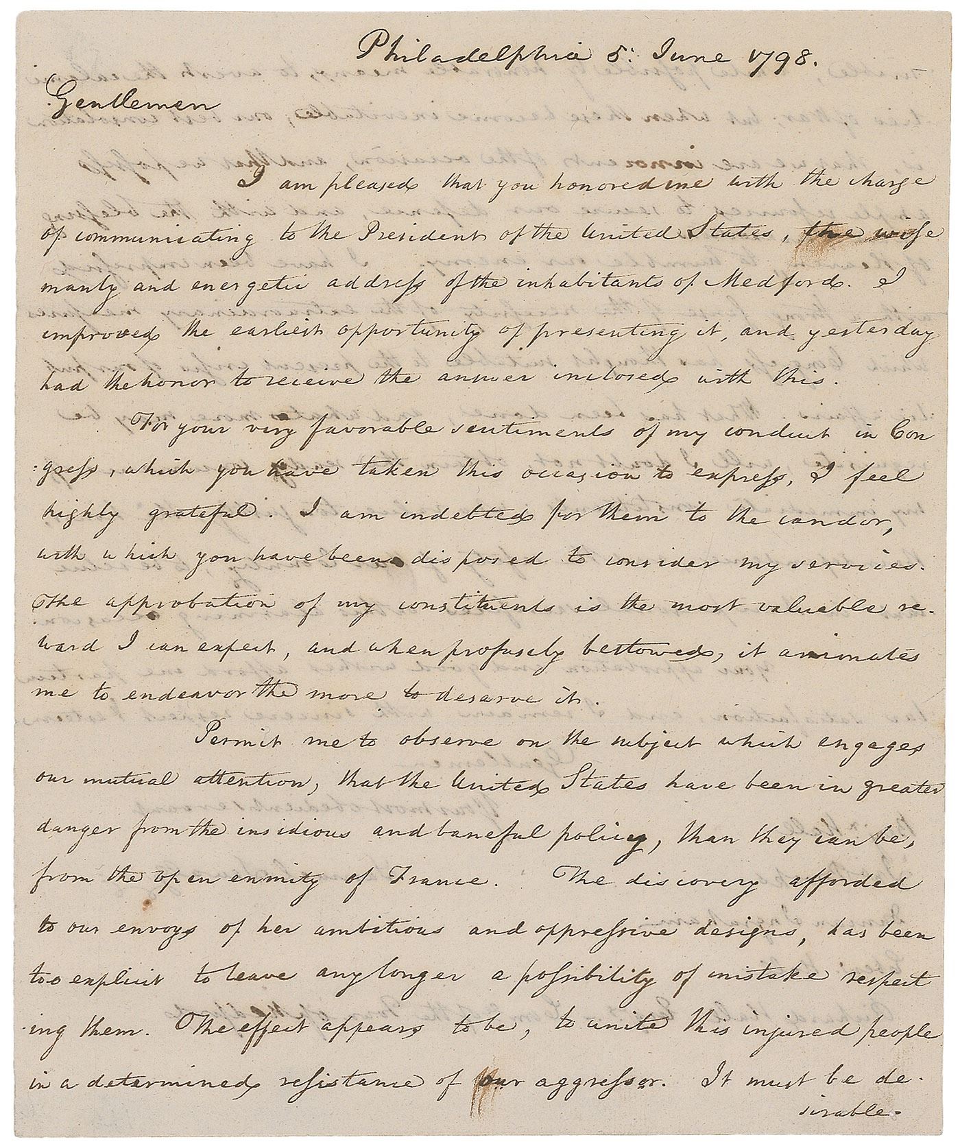 Despite George Washington’s plea for isolationist policies in his farewell address, his successor was swept into intense international disputes stemming from the war between Britain and France. The United States declared neutrality in the conflict but the support of the people was split between Great Britain and France. French privateers began seizing American ships trading with Britain and refused to accept the new US minister sent to Paris in 1796. Refusing to negotiate, France demanded enormous bribes for the restoration of diplomatic relations in what became known as the ‘XYZ Affair.’ While his fellow Federalists called for war, Adams hoped to preserve peace for as long as possible. Rather than formally declaring war, Congress allowed the arming of merchant vessels and the ‘Quasi-War’ commenced. Adams thanks the people of Medford for their support of his decisions and allegiance to the United States, and would soon pass the Alien and Sedition Acts to silence any outspoken opponents. Speaking in tones that characterize his concern for protecting the fledgling nation, this letter exudes Adams’s patriotic sentiments and brilliant statesmanship in navigating both domestic and foreign affairs.