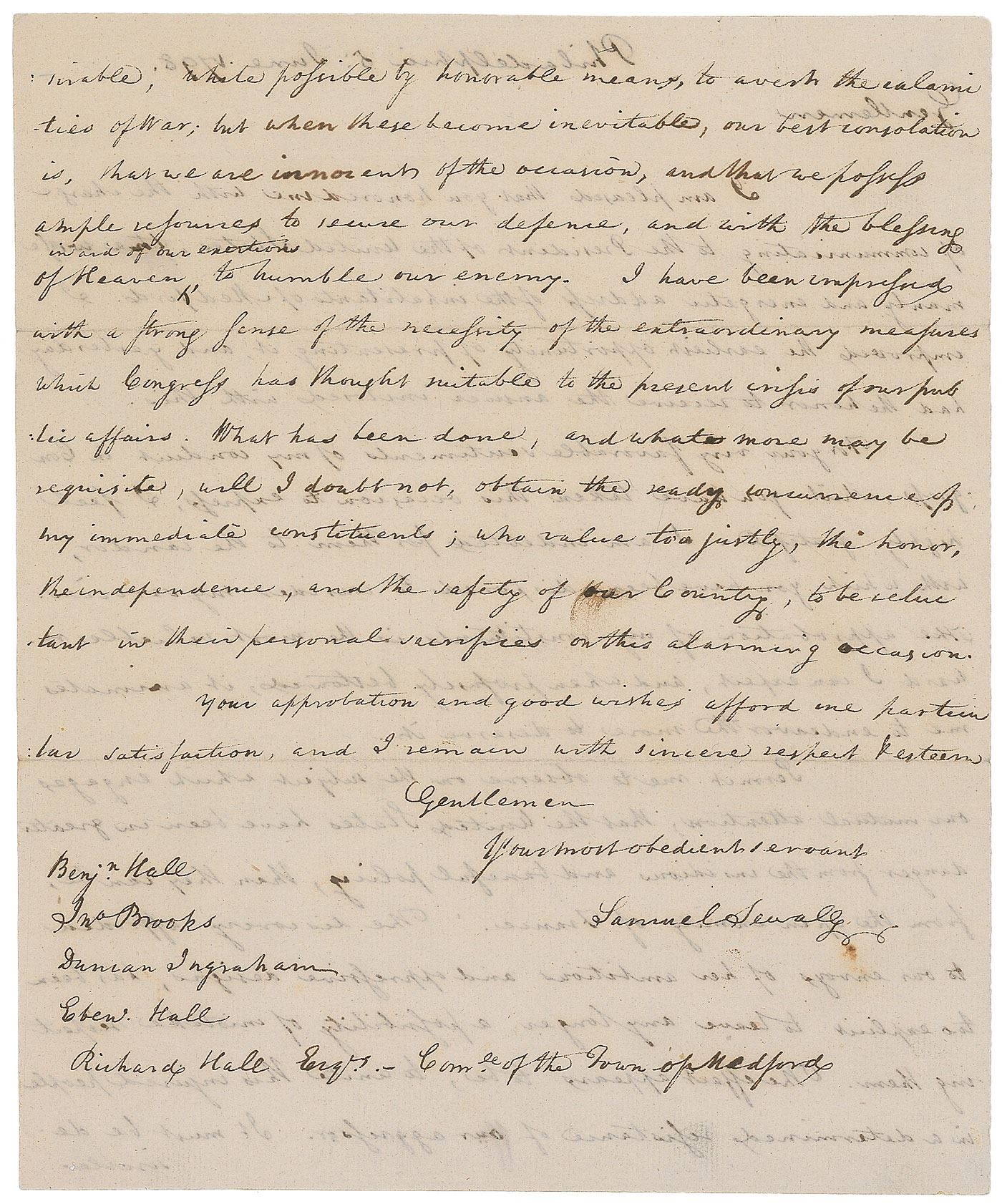 Accompanied by a letter from Congressman Samuel Sewall, dated June 5, 1798, forwarding Adams’s letter to members of the Committee of the Town of Medford. In part: “I am pleased that you have honored me with the charge of communicating to the President of the United States, the wise manly and energetic address of the inhabitants of Medford. I improved the earliest opportunity of presenting it, and yesterday had the honor to receive the answer inclosed with this.” He goes on to discuss the subject of their concerns, the impending war with France over their interference with American shipping: “The effect appears to be, to unite this injured people in a determined resistance of our aggressor. It must be desirable, while possible by honorable means, to avert the calamities of War; but when these become inevitable, our best consolation is, that we are innocent of the occasion, and that we possess ample resources to secure our defense.”