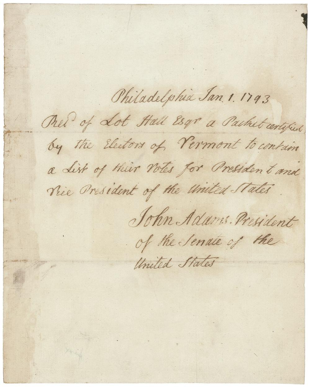 Scarce and historically significant autograph note signed “John Adams, President of the Senate of the United States,” one page, 8'' x 10'', January 1, 1793. An acknowledgment of an important packet from Lot Hall, Presidential Elector for Vermont in 1792. In full: “Rec’d of Lot Hall Esqr. a Packet certified by the Electors of Vermont to contain a List of their Votes for President and Vice President of the United States.” In very good to fine condition, the letter has been professionally silked, with a horizontal fold through “United States” in Adams’ signature, small ink spot to top right, mild toning along left edge from old mounting residue on reverse, and some scattered light toning to body of text. During his first term as vice president, Adams alienated many Jeffersonians who sought to replace him with Founding Father George Clinton of New York. Although the political parties of the day knew that George Washington, who had originally wanted to retire after one term in office but agreed to seek re-election to quell the rise of partisanship, was virtually unbeatable, they felt that his vice president was vulnerable. Following the December 5, 1792, election, votes for president and vice president (then cast independently of each other)—including these from Vermont—were collected and forwarded to the embattled Adams, in his capacity as Senate president, for counting. Adams was probably unaware that the sealed envelope containing the electoral votes were unanimous in supporting his own re-election. In February, 1793, the electoral vote was tabulated by Congress, with George Washington received a vote on every elector's ballot, giving him 132 votes and his second unanimous presidential election. Adams received 77 votes, including all Vermont’s ballots, while his opponent Clinton collected 50 votes. An historically important remarkable official acknowledgment that Adams had received the ballots from the state of Vermont that made George Washington President. PSA/DNA COA.