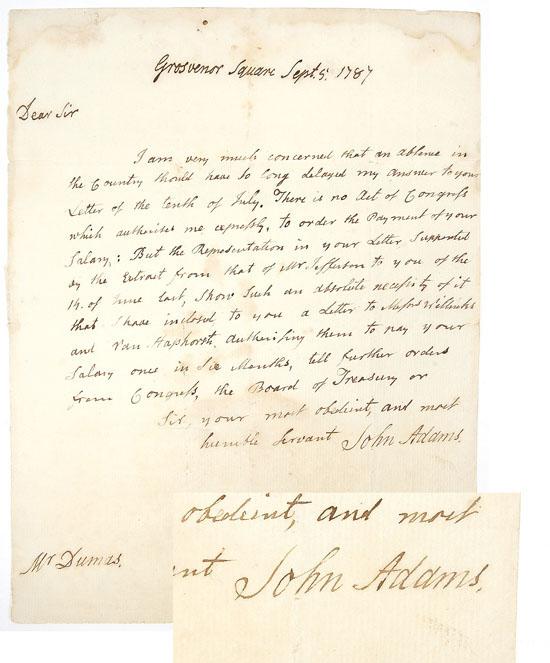 John Adams autograph letter signed as U.S. Ambassador to Great Britain, datelined Grosvenor Square, 5 September 1787. Adams writes to Charles W.F. Dumas, agent for the United States at The Hague, who had greatly aided the cause of the United States in Europe during the American Revolution. Most recently, Dumas had assisted in the treaty between Prussia and the U.S., outlawing privateering; his duty was to have Benjamin Franklin and Thomas Jefferson sign the treaty in Paris, carry it to London to be signed by John Adams, and, finally, to the Hague, for Prussian Minister Baron Thulemeyer's signature. For Dumas to be paid for these travel expenses, an order had to be issued by the U.S. Treasury, which Adams had little patience for. In full, ''Dear Sir, I am very much concerned that an absence in the Country should have so long delayed my answer to your Letter of the tenth of July. There is no Act of Congress which authorises me expressly, to order the Payment of your Salary: But the Representation in your Letter supported by the Extract from that of Mr. Jefferson to you of the 14. of June last, show such an absolute necessity of it that I have inclosed to you a Letter to Messrs Willniks and Van Haphorst, authorising them to pay your Salary once in Six Months, till further orders from Congress, the Board of Treasury or Sir, your most obedient, and most humble Servant John Adams.'' A wonderful letter by Adams to one of America's most loyal European supporters, whose debt America owed both literally and figuratively. Single page measures 10'' x 7'', in very good condition with a large, bold signature. Some uneven toning, a minor dampstain at top edge and a few edge splits at lower margin. Housed in a one-quarter-calf case with gilt lettering.