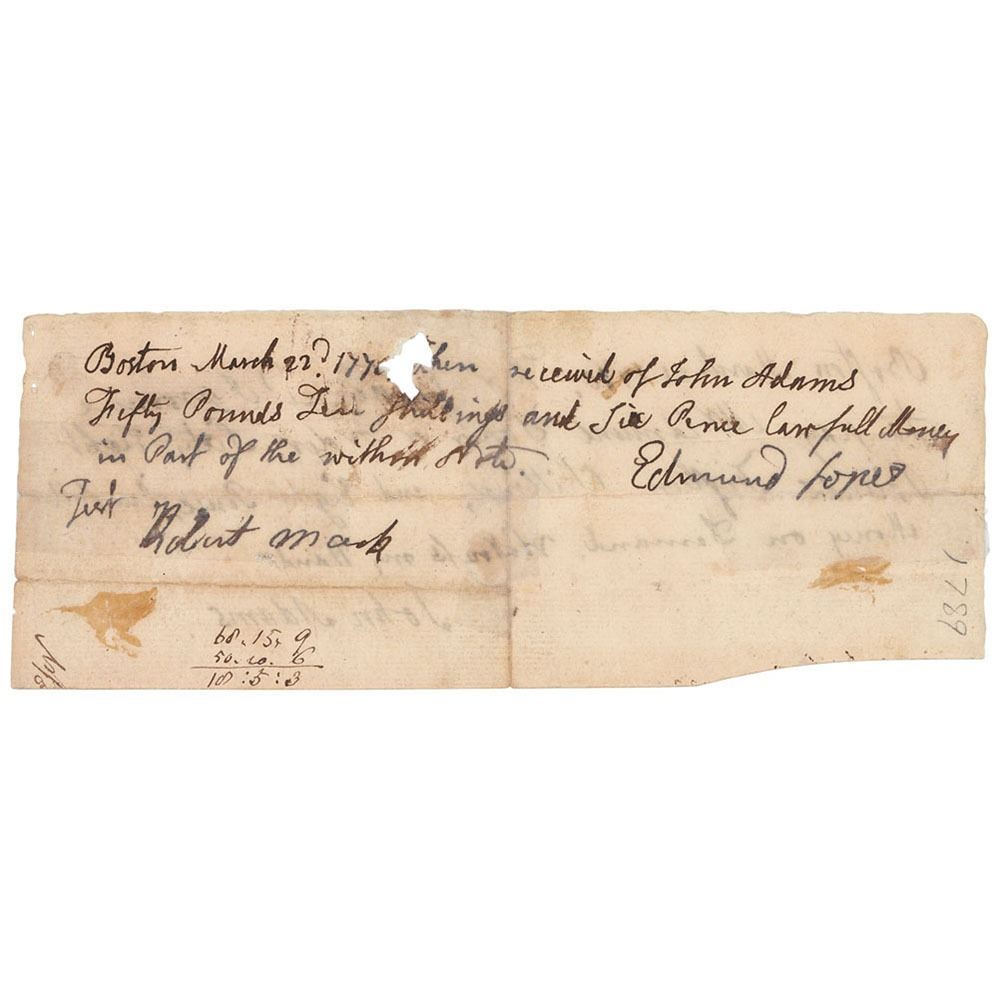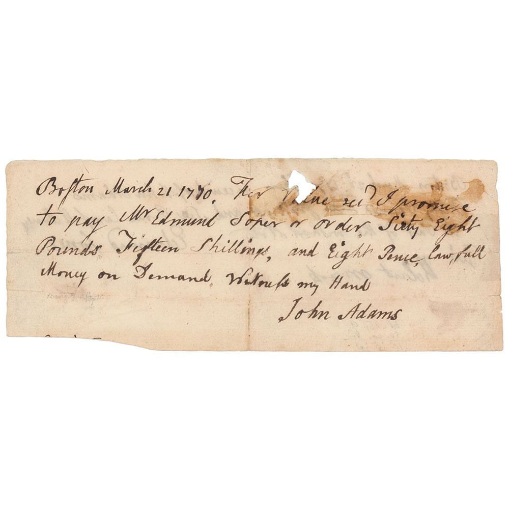 ADS, one page both sides, 7.25 x 3, March 21, 1770. On the front, Adams writes out a promissory note, signing at the conclusion: "Boston, March 21, 1770, For value rec'd I promise to pay Mr. Edmund Soper or order, sixty eight Pounds Fifteen Shillings, and Eight Pence lawfull money on demand, Witness my Hand, Jon Adams." On the reverse, Adams writes out the body of the document, signing within the text: "Boston, March 22d, 1770…received of John Adams Fifty Pounds Ten Shillings and Six Pence lawfull Money in part of the within Note," endorsed below by Edmund Soper. In very good to fine condition, with some old adhesive residue, and a hole affecting a couple of words of text. A fantastic example boasting two bold signatures from the influential founding father.