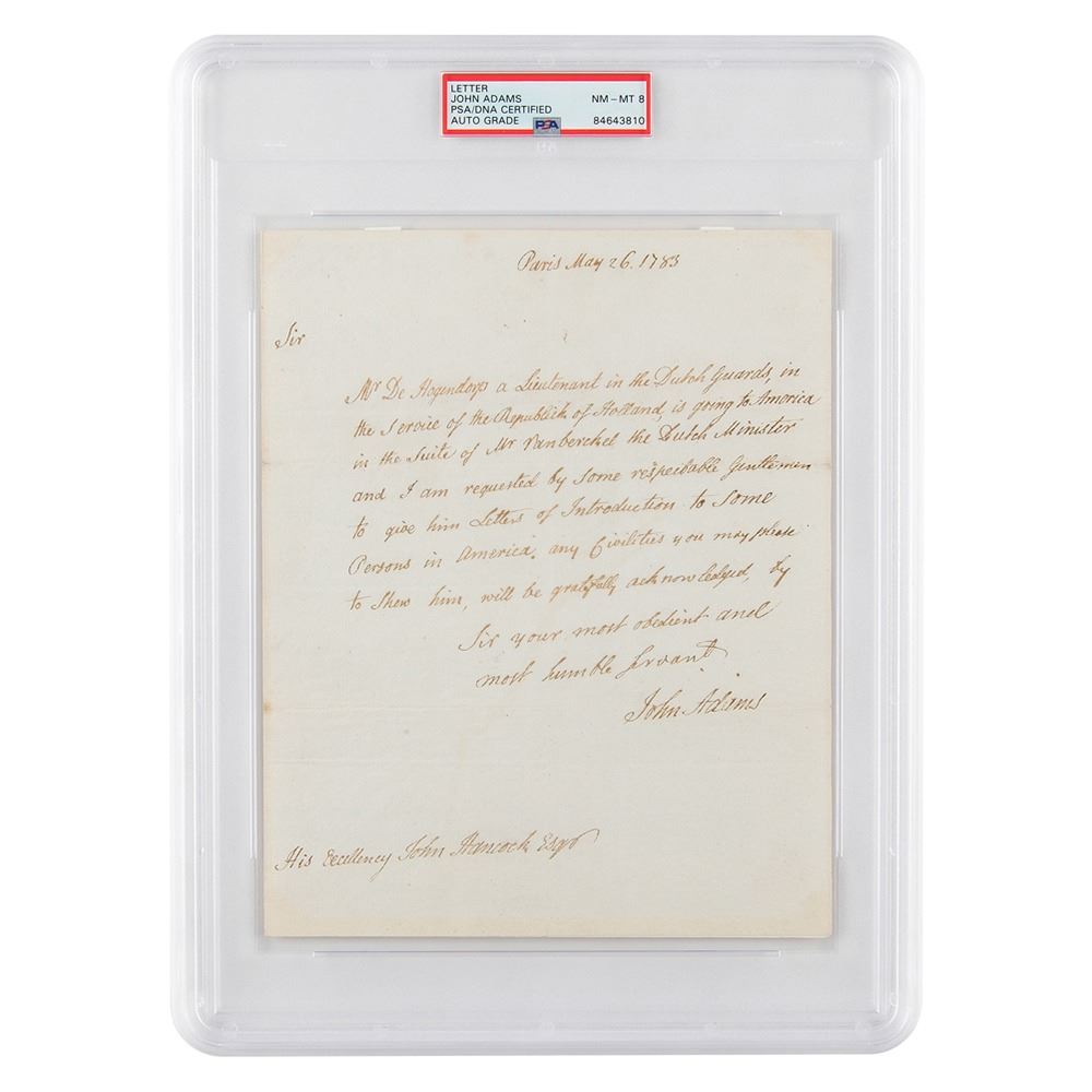 Revolutionary War–dated ALS signed “John Adams,†one page, 7.25 x 9.25, May 26, 1783. Significant handwritten letter to "His Excellency John Hancock," sent from Paris while awaiting the final signing of the Treaty of Paris. In full: "Mr. De Hogendorp, a Lieutenant in the Dutch Guards, in the Service of the Republick of Holland, is going to America in the Suite of Mr. Vanberkel the Dutch Minister and I am requested by some respectable Gentlemen to give him Letters of Introduction to some persons in America. Any civilities you may please to show him will be gratefully acknowledged." In fine to very fine condition. Encapsulated and graded by PSA/DNA as "NM-MT 8."