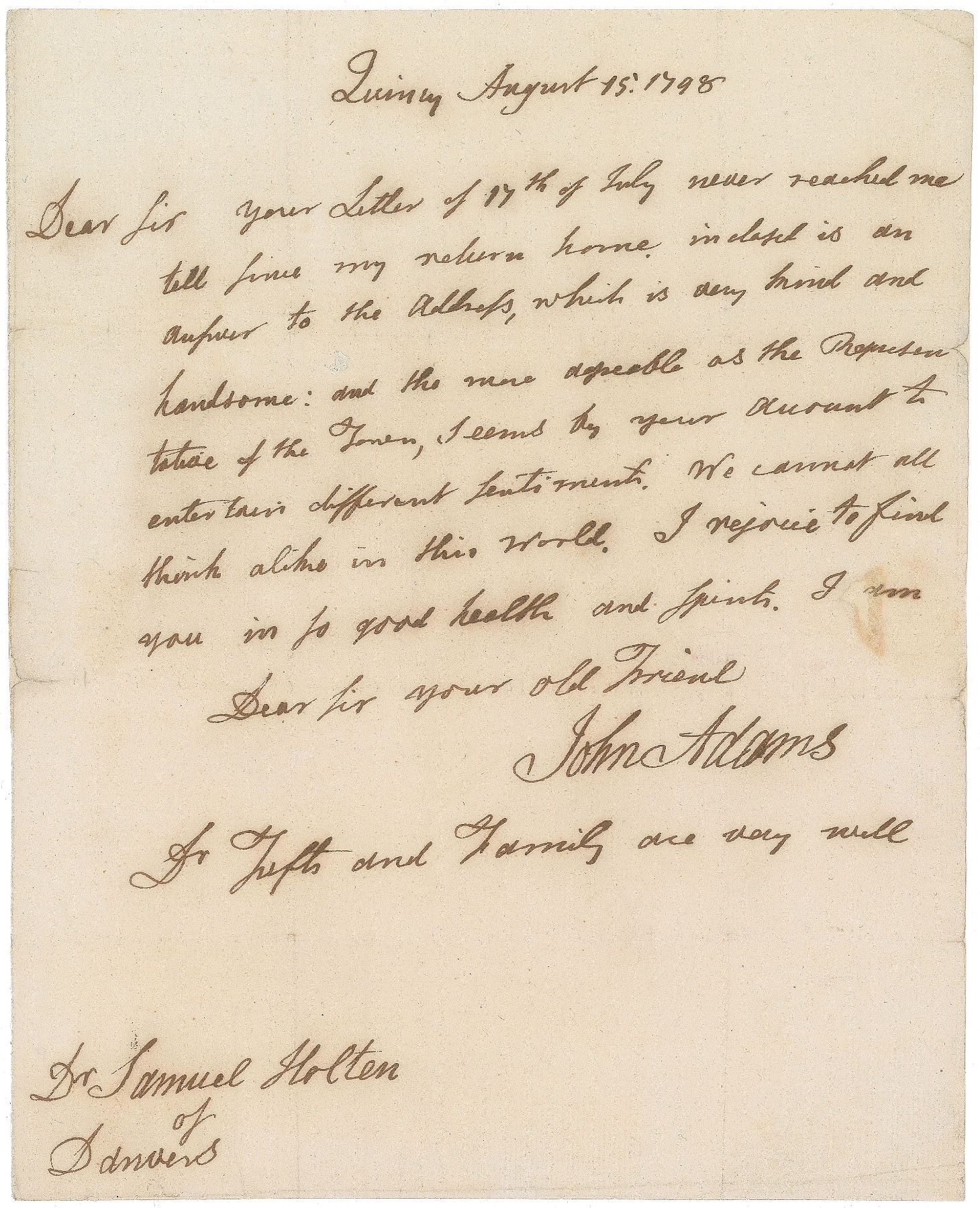 ALS as president, one page, 8 x 10, August 15, 1798. Letter to Dr. Samuel Holten of Danvers. In full: "Your letter of 17th of July never reached me till since my return home inclosed is an answer to the address, which is very kind and handsome: and the more agreeable as the Representative of the Town, seems by your account to entertain different sentiments. We cannot all think alike in this world. I rejoice to find you in so good health and spirits." In a postscript he adds, "Dr. Tufts and Family are very well." Silked on the reverse and in fine condition, with expert repairs to small areas of paper loss.