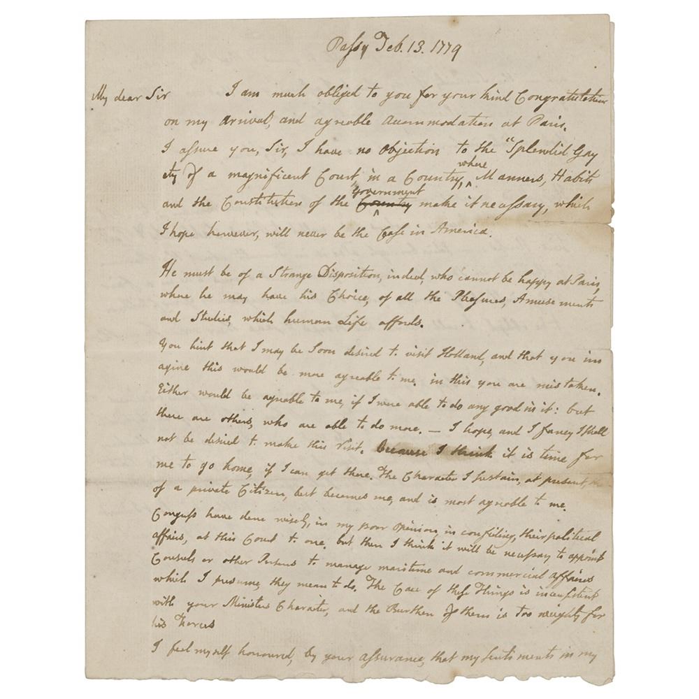 Revolutionary War-dated ALS, one page both sides, 7.25 x 9.25, February 13, 1779. Letter to Richard Henry Lee, written while in Paris as commissioner to France, regarding life at court in Paris and his future plans. In full: "I am much obliged to you for your kind Congratulations on my arrival, and agreeable accommodation at Paris. I assure you, Sir, I have no objection to the 'Splendid Gayety of a magnificent Court' in a Country where Manners, Habits and the Constitution of the Government make it necessary, which I hope however will never be the case in America.