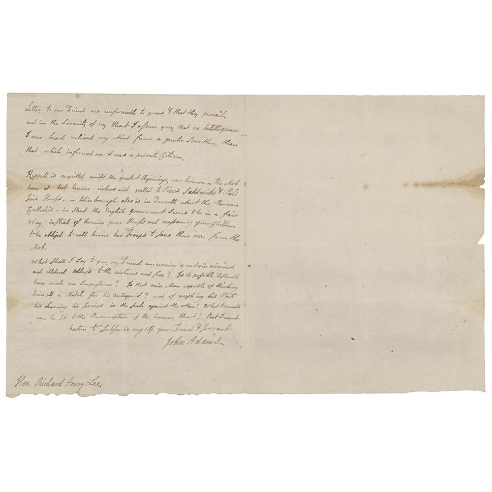 What shall I say to you, my Friend concerning a certain and illiberal Address to the virtuous and free? Is it possible it should have made an Impression? Is that vain Man capable of thinking himself a Match for his antagonist? And of weighing his Parts his Learning his services in the scale against the other? What Bounds can be set to the Presumption of the human Heart?" In fine condition, with some light staining, and slight splitting along folds. Provenance: Christie's, 2012; The Everett Fisher Collection.