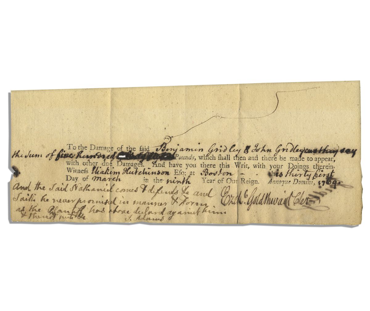 Early John Adams autograph note signed, ''J. Adams'' as a lawyer in Boston, Massachusetts. Dated 31 March 1769, court summons is partially printed, with Adams' note reading, ''And the Said Nathaniel comes & defends &c and Saith he never promised in manner & Form as the Plaintiff has above declared against him.'' That same year Adams got his first big break as an attorney defending John Hancock against charges of smuggling. Partial document measures 7.25'' x 3''. Minor paper loss in two places from an ink burn and mild toning, else near fine.
