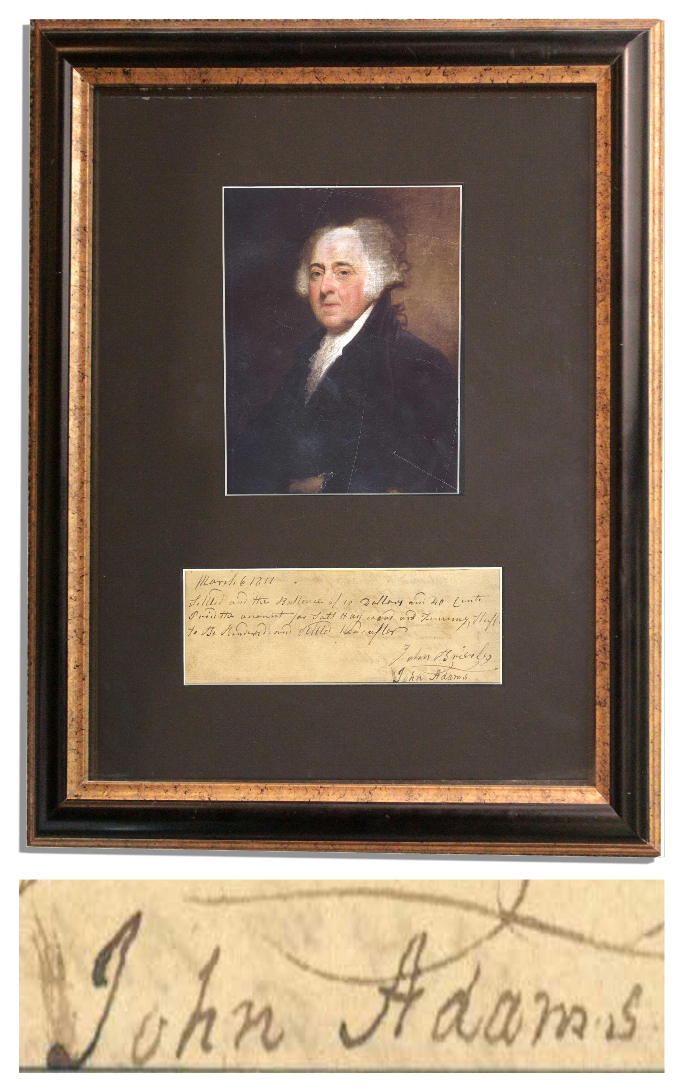 John Adams document signed, dated 6 March 1811. Here, Adams signs a receipt of a warrant paid, with ''...the ballance of 10 Dollars and 40 Cents paid…'' Signed ''John Adams'' with a small smudge on the J in John. Document measures 5'' x 2'' and is nicely framed with a portrait engraving of Adams to an overall size of 13.25'' x 16''. Near fine condition.