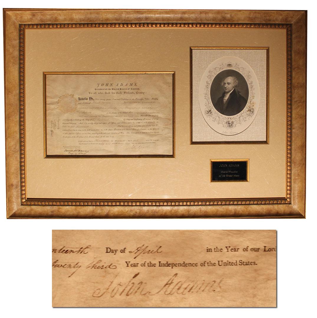 John Adams appointment signed as President, dated 17 April 1799. Here, Adams appoints Samuel Harrison as First Lieutenant. Document reads in part, ''…I have nominated and by and with the advice and consent of the Senate do appoint him as first Lieutenant in the thirteenth Regiment of Infantry in the service of the United States: to take rank as such…'' Nice, clear ''John Adams'' signature at conclusion. Also signed by the Secretary of War, James McHenry. Document is beautifully preserved in a gilt frame with a cream colored mat measuring 38.35'' x 27''. The document, which has creasing and folds throughout, measures 16'' x 10.25''. Overall in very good condition with original U.S. blindstamped seal intact. Also includes portrait engraving and placard of the second President of the United States.