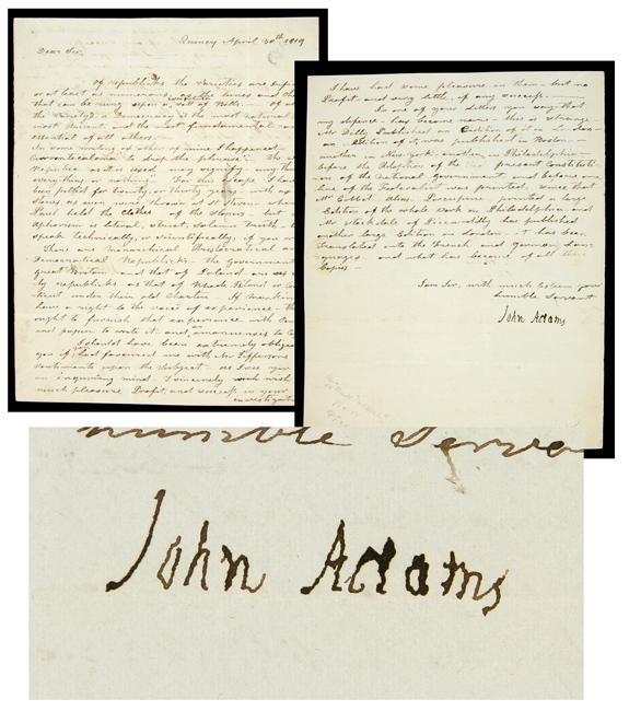 John Adams Discusses "Republicks" And Mentions Jefferson (1735-1826) 2nd President of the United States (1797-1801). Letter Signed, 2 pp (recto/verso), 10" x 8", Quincy, April 30, 1819. To an unidentified correspondent, with some of the finest John Adams content extant.