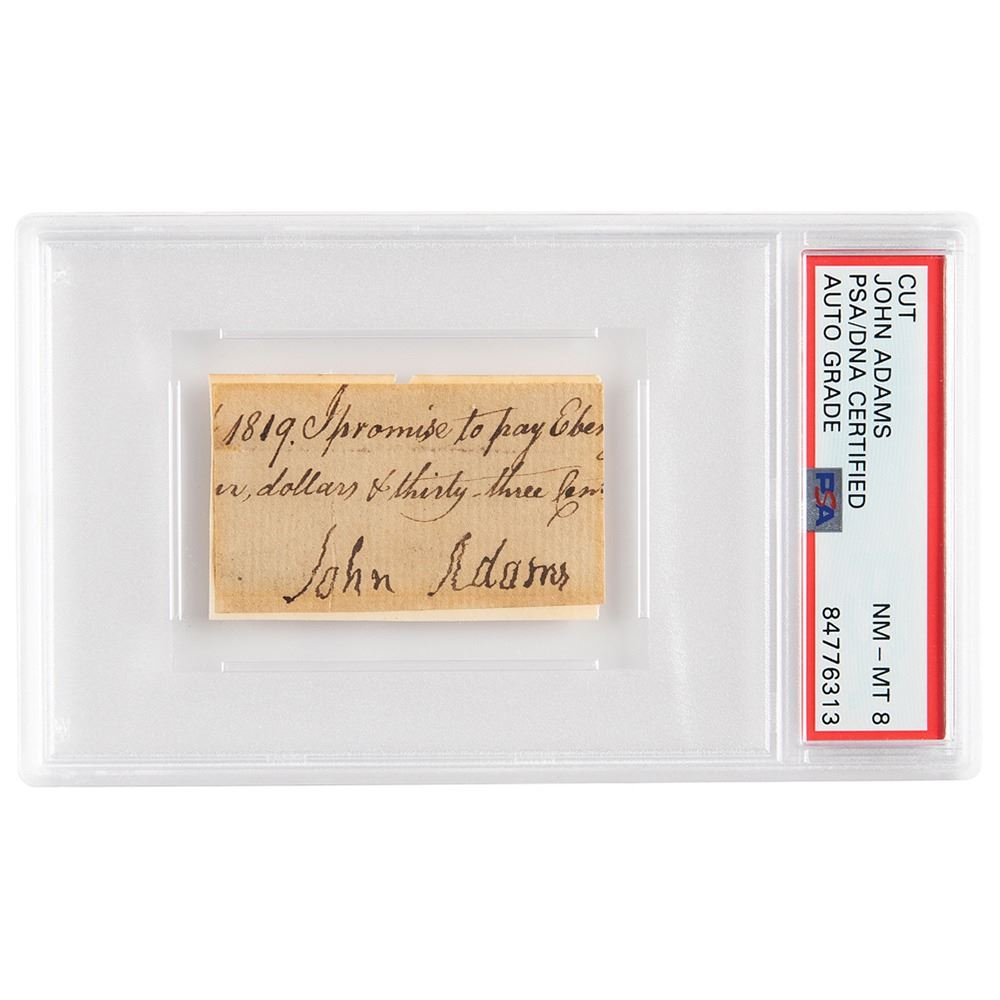 Bold ink signature, "John Adams,& rdquo; on an off-white 2 x 1.25 slip clipped from a financial document. In fine condition. Encapsulated and graded by PSA/DNA as "NM-MT 8."