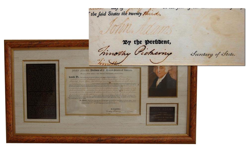 John Adams document signed as President, dated 17 July 1798 from Philadelphia. Partially printed document appoints a group of men from Massachusetts to implement a new law to collect property taxes, including slaves, in preparation for bearing war costs with France in the undeclared naval ''Quasi War.'' Although the law enabled federal officials to assess property and collect tax, in a nod to state sovereignty, a local board in each state was created to interact with the public; this document appoints the Massachusetts board and reads in part, ''...Thomas Dawes, Nathaniel Dummer, Nathaniel Wells, Nathan Dane, Eleazor Brooks, Beza Haywood, Joseph Allen, Abel Whitney, and WIlliam Bacon, all of the State of Massachusetts...Commissioners of the United States under the Act of Congress of the United States, passed on the ninth day of July 1798, entitled 'An Act to provide for the valuation of lands and dwelling houses and the enumeration of slaves within the United States'...and do authorize them to execute and fulfill the duties of their said offices, according to law...'' Countersigned by Secretary of State Timothy Pickering. Document, measuring 14.5'' x 9'', has some separation at folds, affecting a few words, but not the signatures. Adams' signature is light though still large and legible. Light transference of seal in blank area from folding. Document has been de-acidified and archivally framed to a size of 39'' x 21.5''. Very good condition.