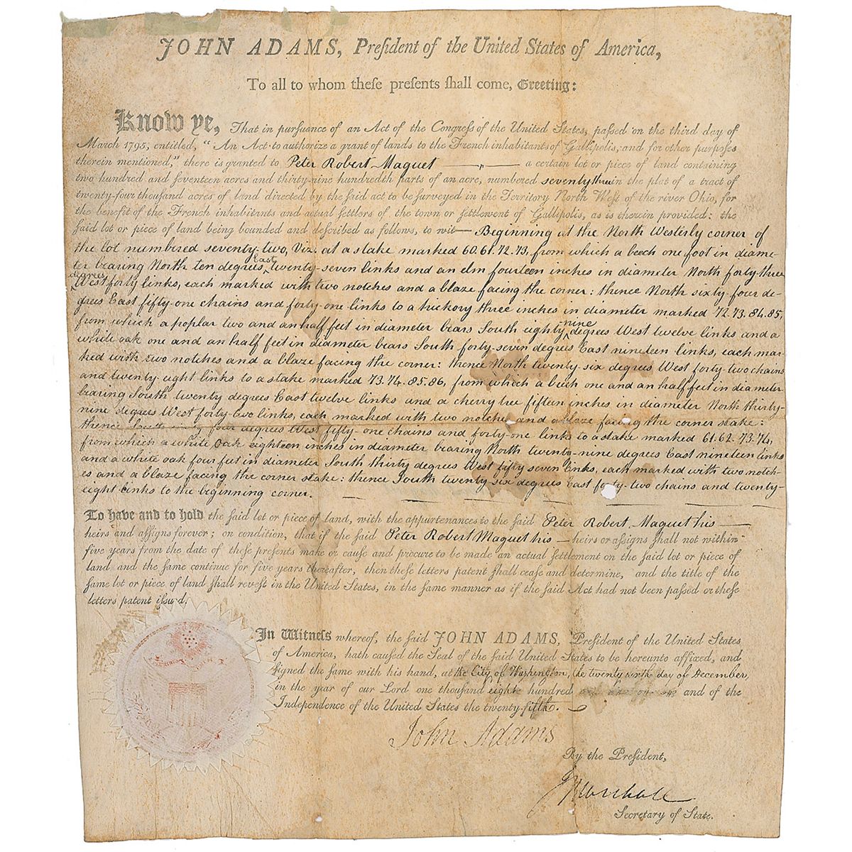 Partly-printed vellum DS, signed “John Adams,” as president and “John Marshall,” as secretary of state, one page, 11.75 x 14, December 26, 1800. Land grant issued to Peter Robert Maguet for 217 acres in Gallipolis, Ohio. Signed at the conclusion by Adams