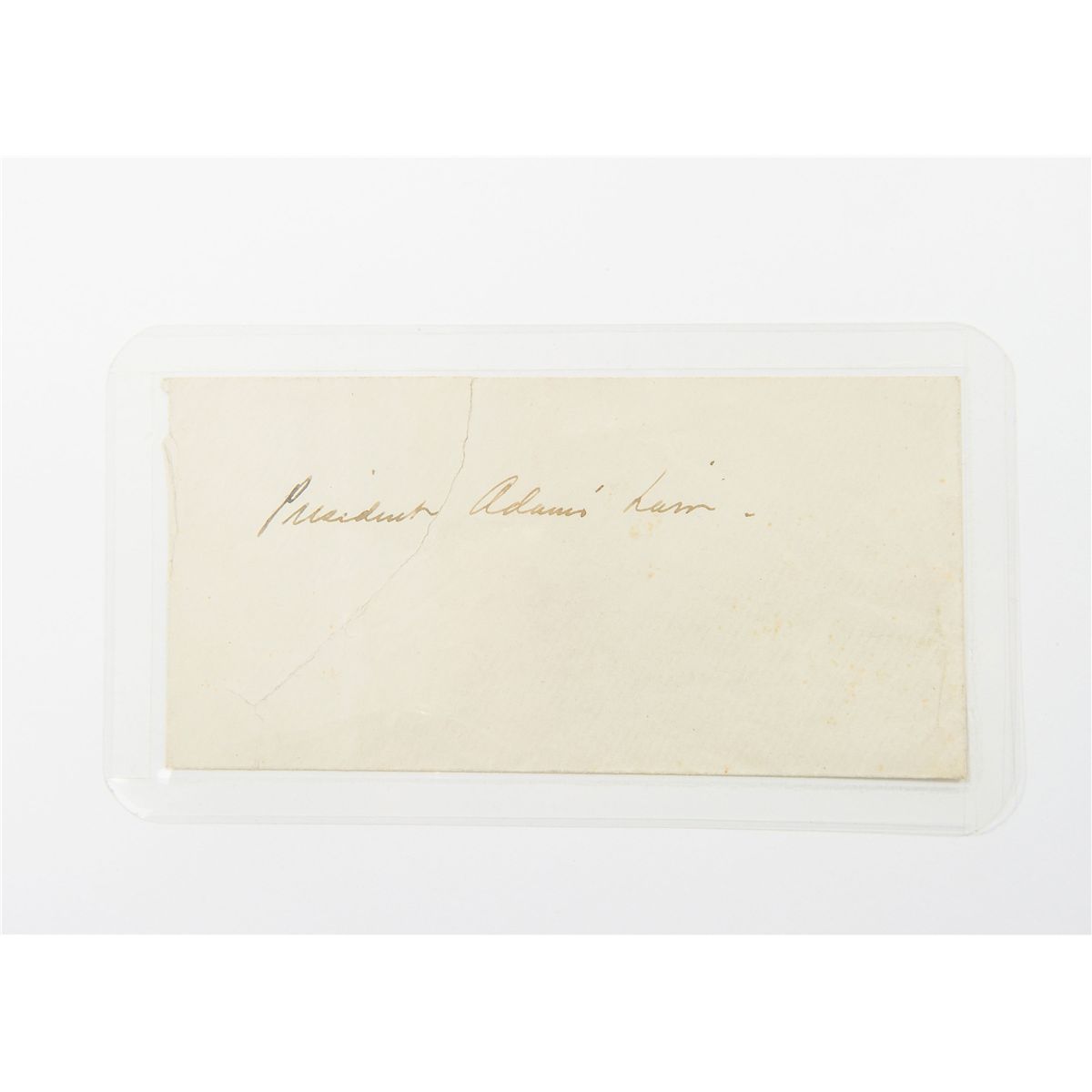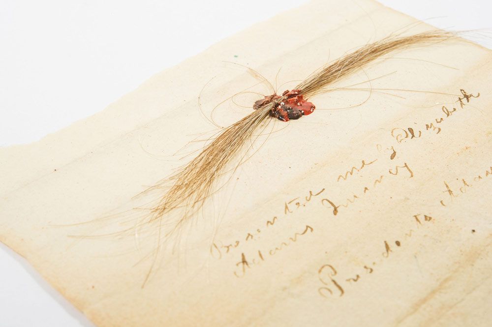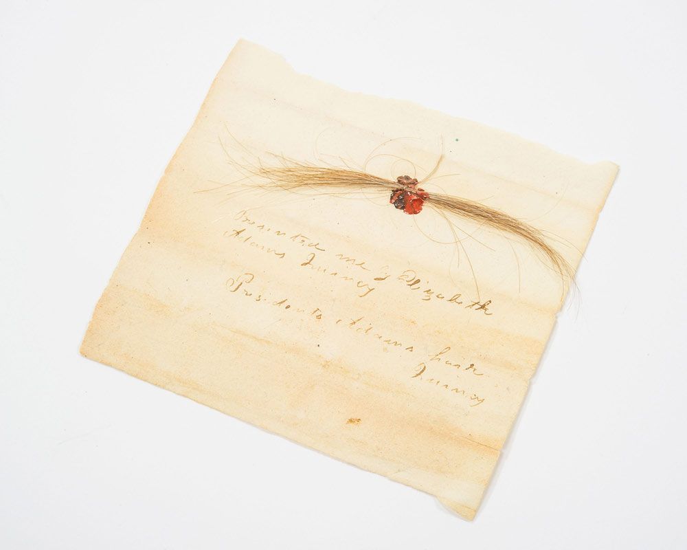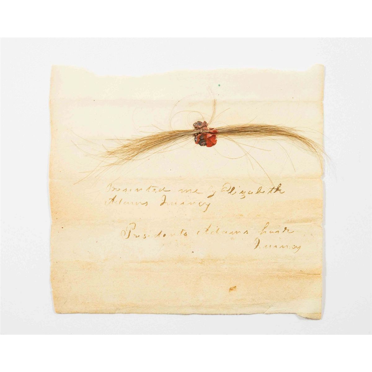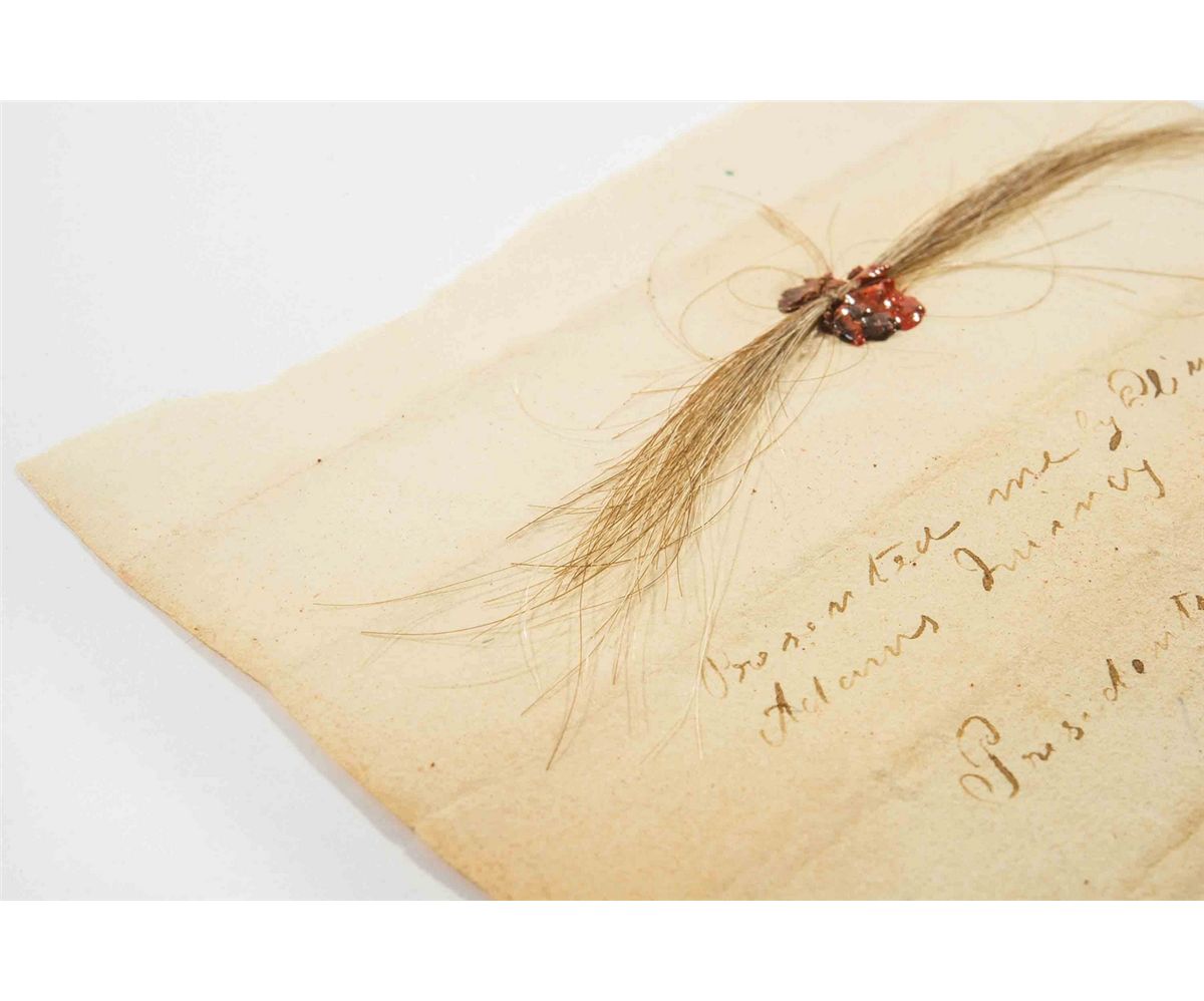 A very rare substantial lock of founding father John Adams’s hair, originally obtained from the estate of George F. Noyes of Portland, Maine. Hairs measure approximately 3.5? in length and the lock is affixed to a 4 x 3.75 off-white sheet with a single spot of red wax. Notation on the sheet reads, “Presented me by Elizabeth Adams Quincy, President Adams hair Quincy.” Accompanied by the original period envelope the hair was discovered in, labeled “President Adams’ hair.” Also accompanied by a desirable and important letter of provenance which states, in part: “The enclosed lock of President John Adams hair was uncovered while searching through the estate of George F. Noyes of Portland, Maine. He was a Civil War officer on General Abner Doubleday’s staff. The remnants of his belongings included several boxes of papers and included a letter from Doubleday, many letters to his wife, several thousand envelopes, etc…This [ generous] lock of hair was in a sealed envelope, stuffed among the many others.”