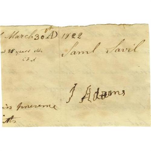 <B>John Adams, his Signature, "</B></I><I>J Adams"</B></I> on a 3.5" x 2.5" slip<I>.</B></I> Irregular margins, light vertical crease, else very good. <I>Ex. Henry E. Luhrs Collection.</B></I><BR><BR><b>Shipping:</b> Flat Material, Small (<a target="_blank" href="http://www.heritageauctions.com/common/shipping.php">view shipping information</a>)