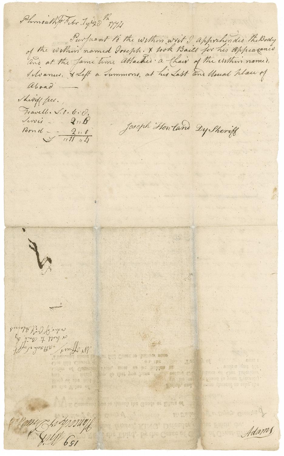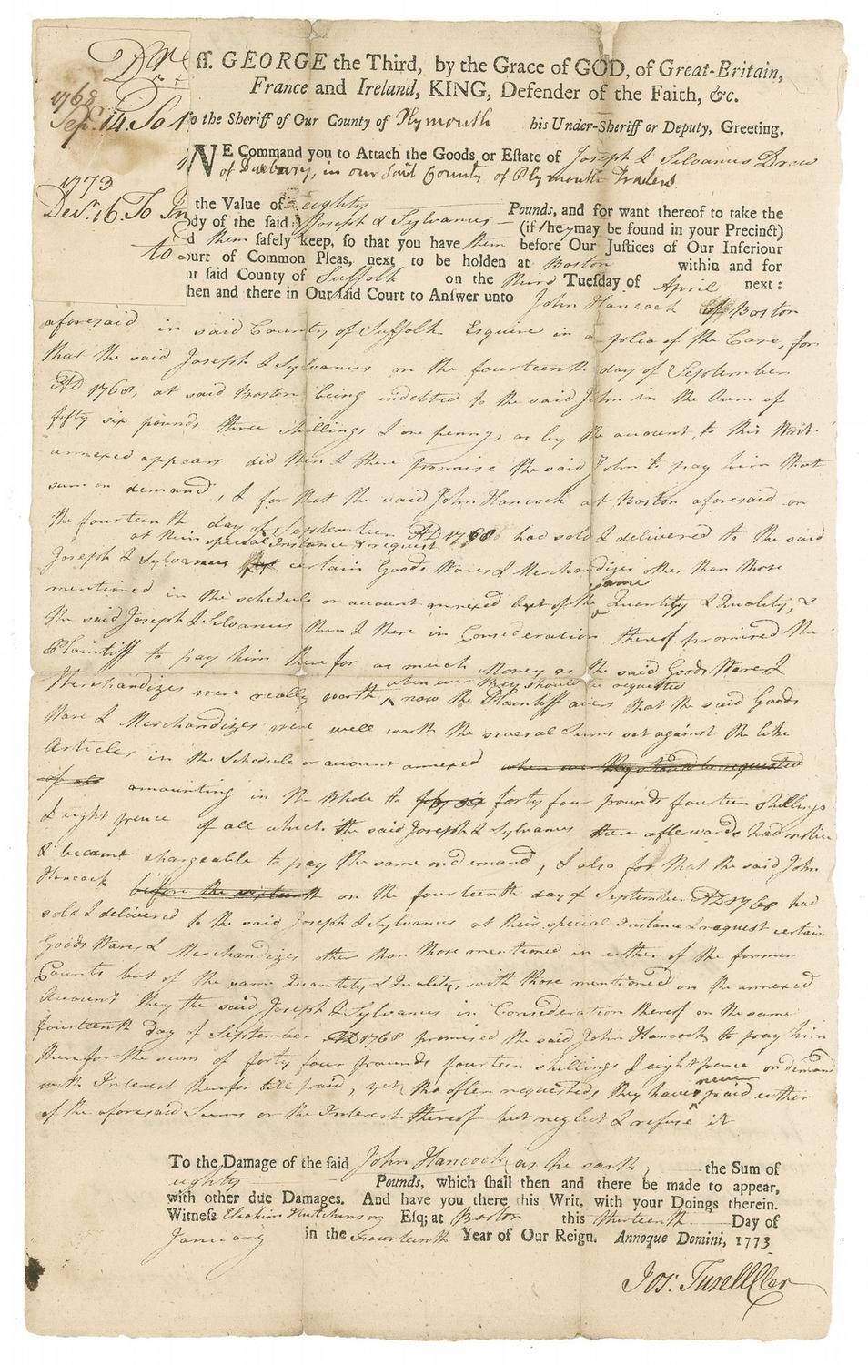 Partly-printed DS, endorsed on the reverse as simply “Adams,” one page, 7.75 x 12.5, January 13, 1773. A writ for John Hancock to collect a debt owed to him by another man. Penned in an unknown hand, the document reads in part: “John Hancock of Boston…in a plea of the Case for that the said Joseph I. Silvanus…being indebted to the said John in the sum of fifty six pounds, three shillings & one penny, or by the amount to this Writ…did then and there promise the said John to pay him that sum on demand, & for that the said John Hancock…has sold & delivers to the said Joseph I. Silvanus…certain Goods, Wares & merchandise other than those mentioned in the schedule.” In the lower blank corner of the reverse, Adams has endorsed as “Adams”; he also adds on the front of the document at the top,“Plymouth” and “of Duxbury in our said county of Plymouth Traders.” Document also retains a partial attached receipt which coincidently incorporates the date of the Boston Tea Party, December 16, 1773 (although the Adams document offered here has no relation to the event). In very good condition, with professional repairs along intersecting folds, several other partial separations along folds, scattered toning and soiling, and archival tape repair to the reverse of a complete separation of the aforementioned attached receipt.