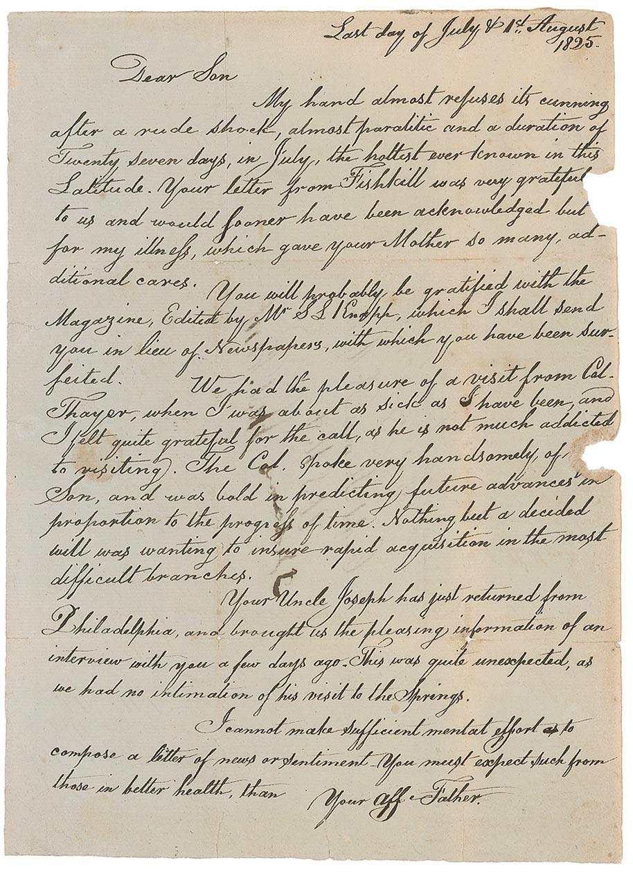 Dictated free franked letter, shakily signed “J. Adams,” as a franking signature, one page, 8.5 x 11.75, dated “Last day of July & 1st August 1825,” to his grandson Thomas B. Adams, a cadet at West Point. In full: “My hand almost refuses its cunning after a rude shock, almost paralitic and a duration of Twenty seven days, in July, the hottest ever known in this Latitude. Your letter from Fishkill was very grateful to us and would soon have been acknowledged but for my illness, which gave your Mother so many additional cares. You will probably be gratified with the Magazine, Edited by Mr. S. L. Knapp, which I shall send you in lieu of Newspapers, with which you have been surfeited. We had the pleasure of a visit from Col. Thayer when I was about as sick as I have been, and I felt quite grateful for the call, as he is not much addicted to visiting. The Col. Spoke very handsomely of [you] Son, and was bold in predicting future advances in proportion to the progress of time. Nothing but a decided will was wanting to insure rapid acquisition in the most difficult branches.