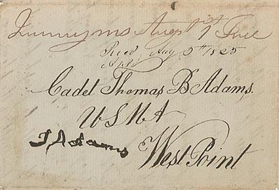 Reverse bears an address panel in another hand to “Cadet Thomas B. Adams, USMA, West Point,” postmarked across the top “Quincy ms, August 1st Free,” and franked in the lower left “J. Adams.”