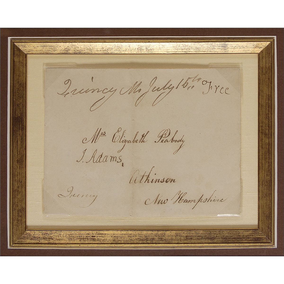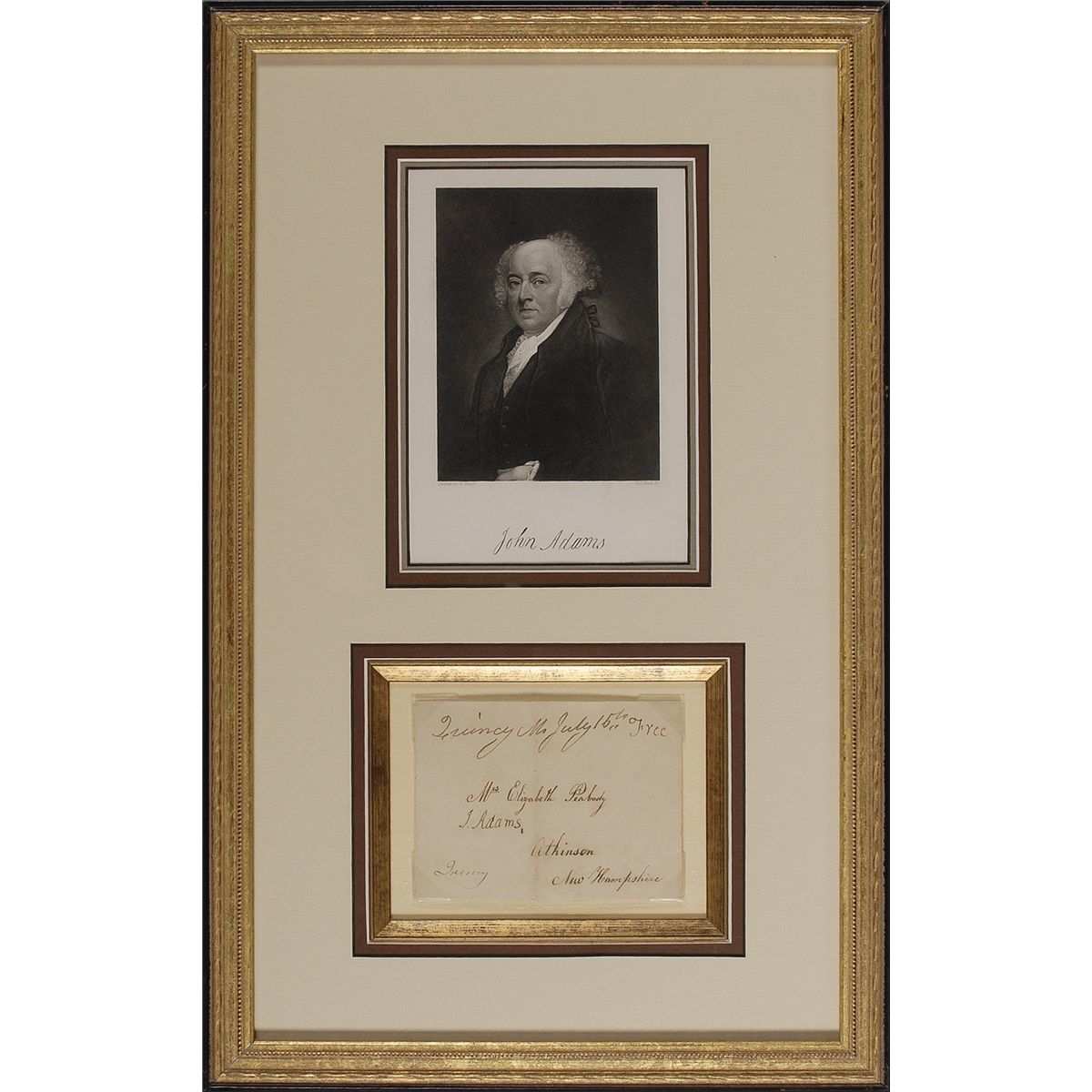 Free franked address panel, addressed in another hand (perhaps his wife), to “Mrs. Elizabeth Peabody, Atkinson, New Hampshire,” and franked by Adams in the upper right “Free,” and signed in the center, “J. Adams.” Panel also bears a handwritten postmark, “Quincy Ma, July 15th.” Double cloth matted (by its corner tips) and framed with a portrait of Adams, to an overall size of 12.5 x 20. In fine condition, with a central vertical fold and some scattered light toning. Elizabeth Peabody was his wife Abigail’s sister. A splendid example ready for display.