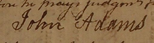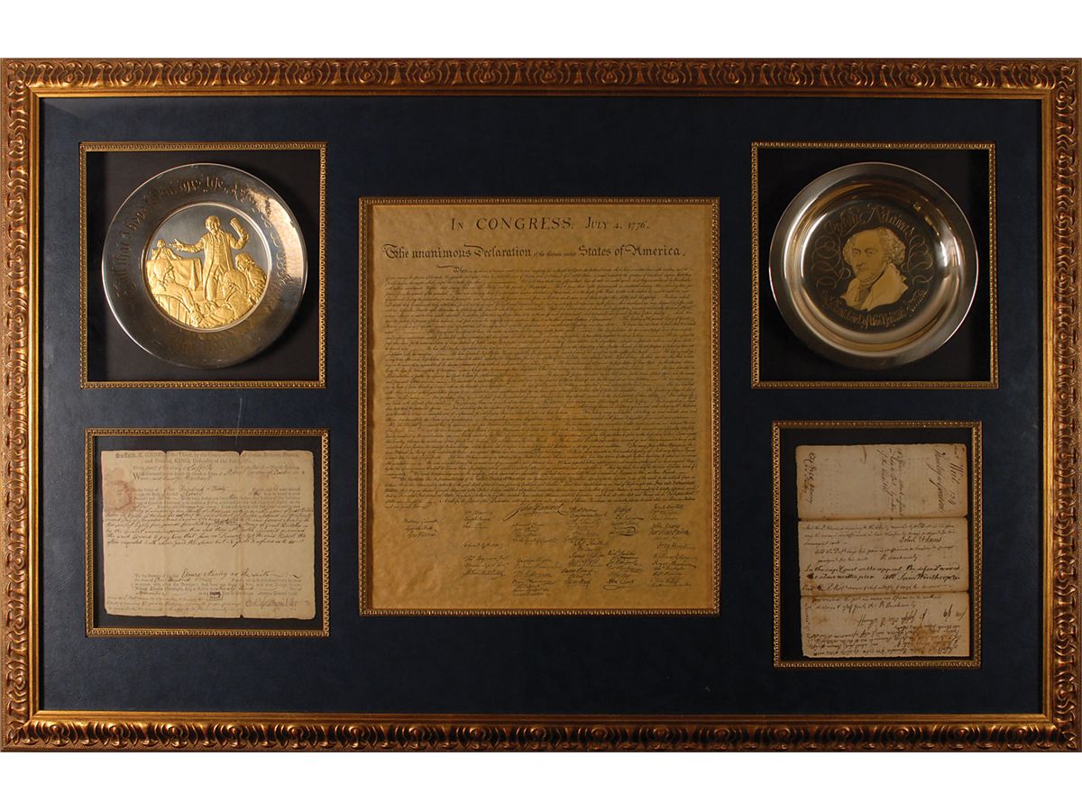 Endorsement, signed “John Adams,” on the reverse of a one page document. 6.5 x 8, November 23, 1768. Document orders the Sheriff of Suffolk County to take Robert Gordon into custody to answer a charge brought on by Edward Stanley of London on Gordon’s failure to pay him £130. Endorsement, written in an unknown hand reads, “And this Edward agreeing to the liberty reserved by the Defs in his plea says the same is insufficient in law therefore he prays judgement for his damages & cost.” Impressively suede-matted and framed with two gold-inlaid, sterling silver portrait plates issued in a limited edition by the Franklin Mint in the early-to-mid 1970s, a well-done copy of the front of the document, and a large copy of the Constitution, to an overall size of 42 x 27. Scattered toning, a bit heavier along horizontal folds, a few chips to edges, circular toning from wax seal, and light show-through from text on opposite side, otherwise very good condition. Oversized.