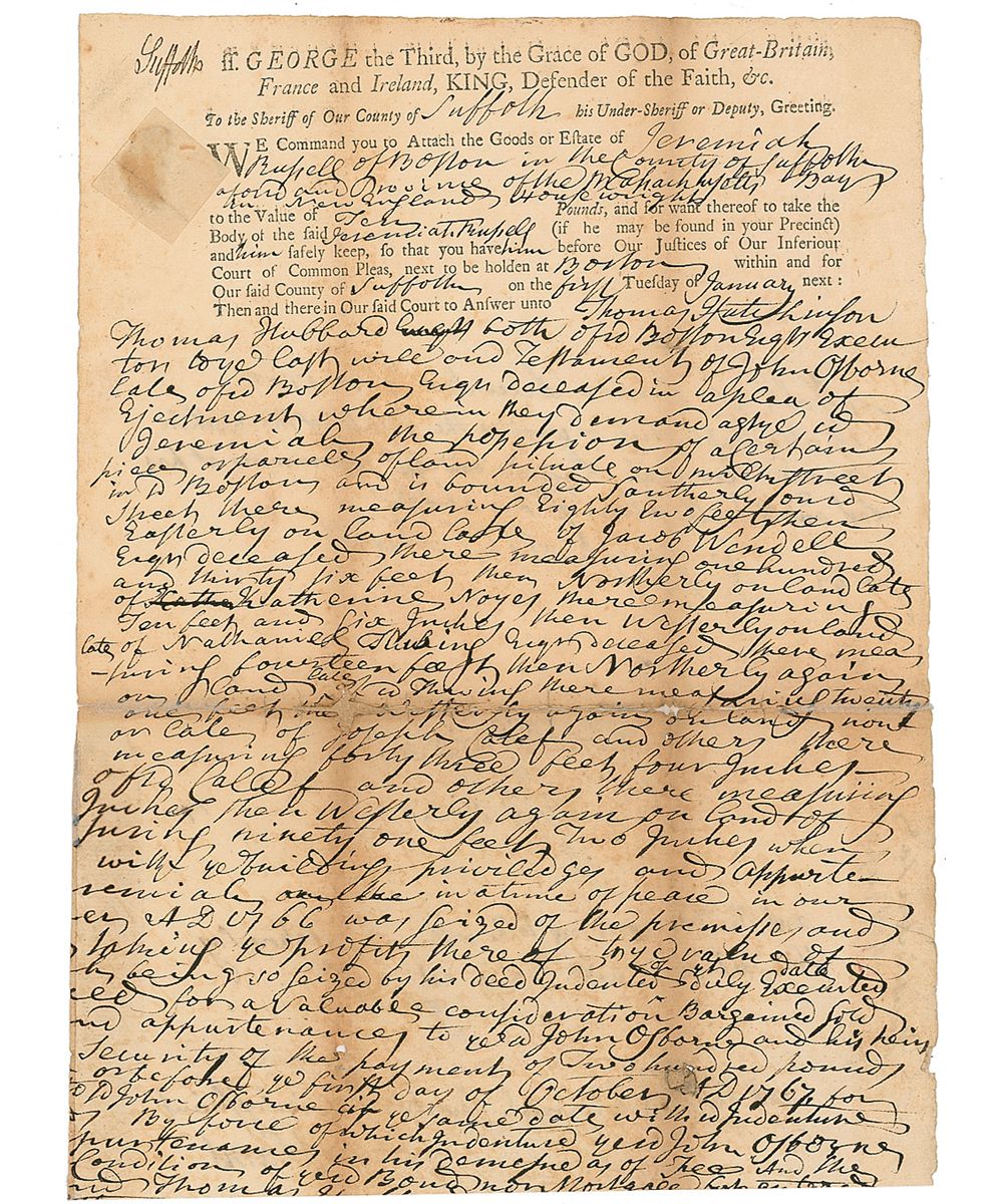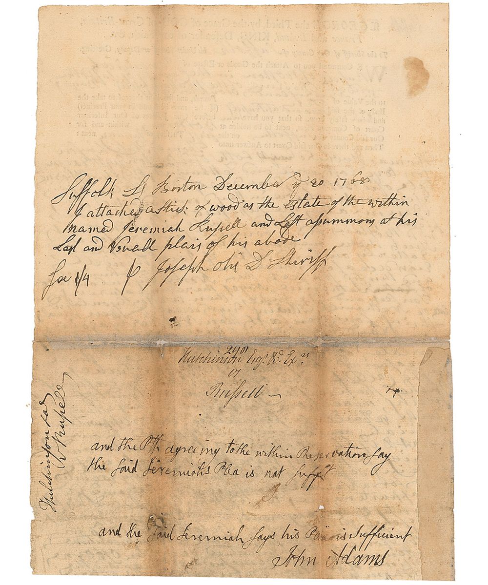 Handwritten endorsement, signed “John Adams,” on the reverse of a partial manuscript document, one page, 7.5 x 10.5, circa December 1768, ordering the Sheriff to “Attach the Goods of Estate of Jeremiah Russell of Boston,” regarding a piece of land from the estate of John Osborne. On the reverse Adams writes, “and the Pttf agreeing to the within Reservation say the said…plea is not sufft, and the said Jeremiah says his Plea is sufficient.” Intersecting folds, tape repair to horizontal fold, trimmed bottom edge, scattered toning, and a few small holes along folds, otherwise very good condition. Accompanied by an unsigned engraving. Adams had been serving as a lawyer for the past 10 years, and at the time of this endorsement, was a fierce opponent of the Stamp Act, having published several anonymous articles as well as drafting the Braintree Instructions.