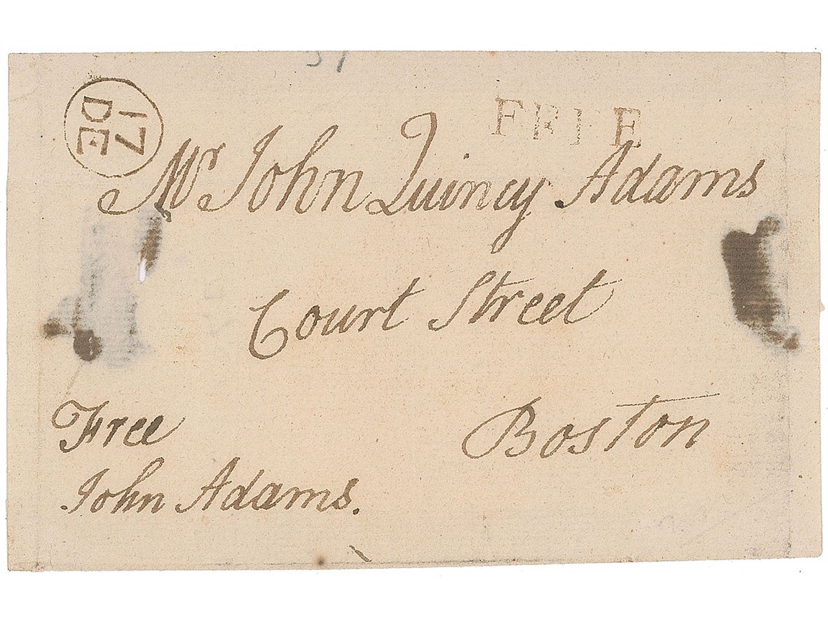 Desirable free-franked mailing panel, 5 x 3.25, addressed by Adams to “Mr. John Quincy Adams, Court Street, Boston,” and franked in the lower left, likely as president, “Free John Adams,” with a “Free” stamp above the address. In fine, clean condition, with a small hole to left side, and a couple small ink marks to edges. An unusual association between two related chief executives.