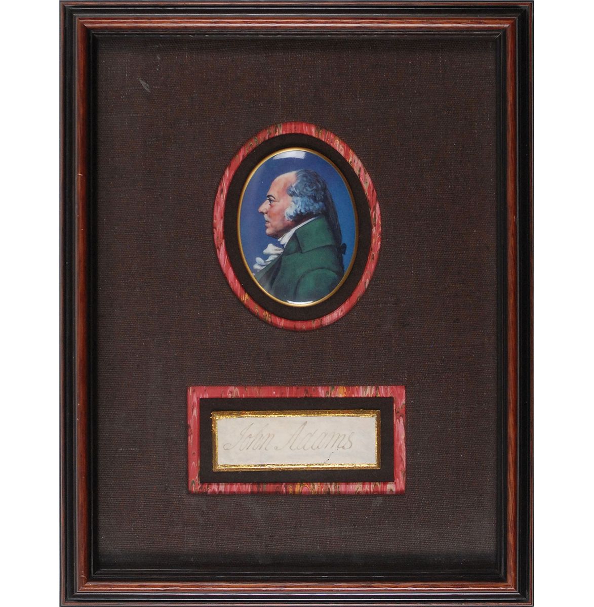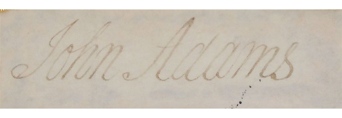 Ink signature, “John Adams,” on an off-white 3.25 x 1 slip clipped from a larger letter or document. Slip is affixed to a slightly larger mount and double-cloth-matted and framed with a color cameo portrait to an overall size of 10.25 x 13.5. In fine condition, with a light vertical fold through a single letter of first name of signature.