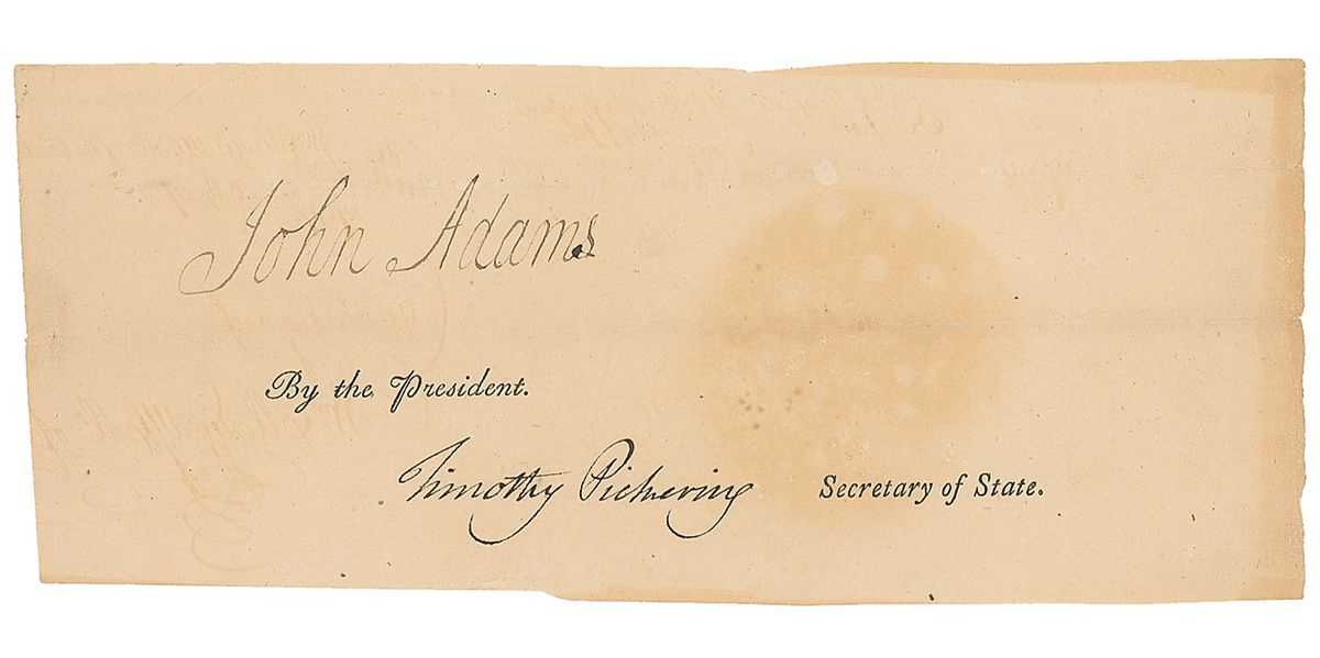 Impressive ink signature, as president, “John Adams,” on an off-white 9 x 3.75 sheet clipped from a larger document and also signed by Secretary of State Timothy Pickering. In fine condition, with a couple of light horizontal folds above and below signature, and a light circular area of toning to right side. A choice example of the second president, measuring three inches long, and offering wide margins for matting purposes.