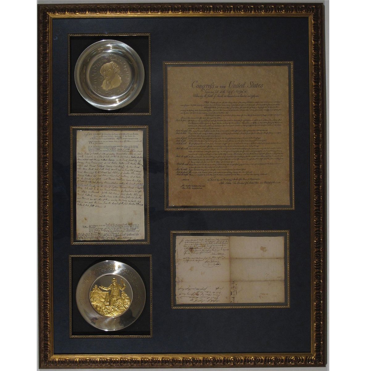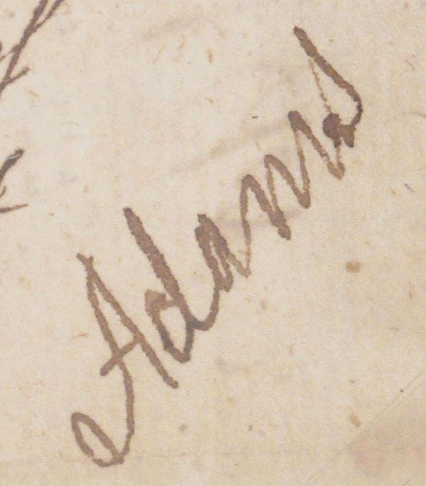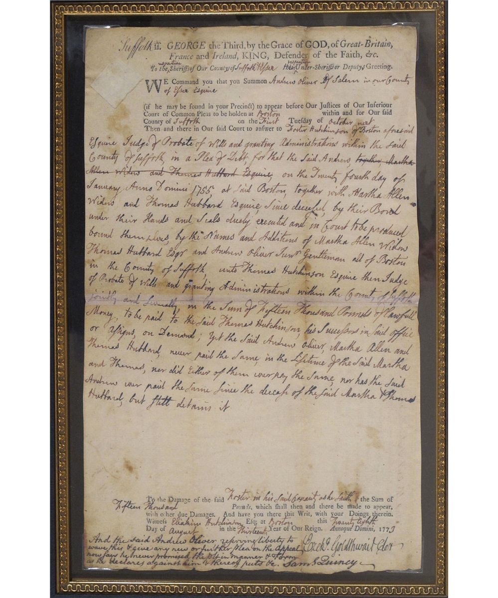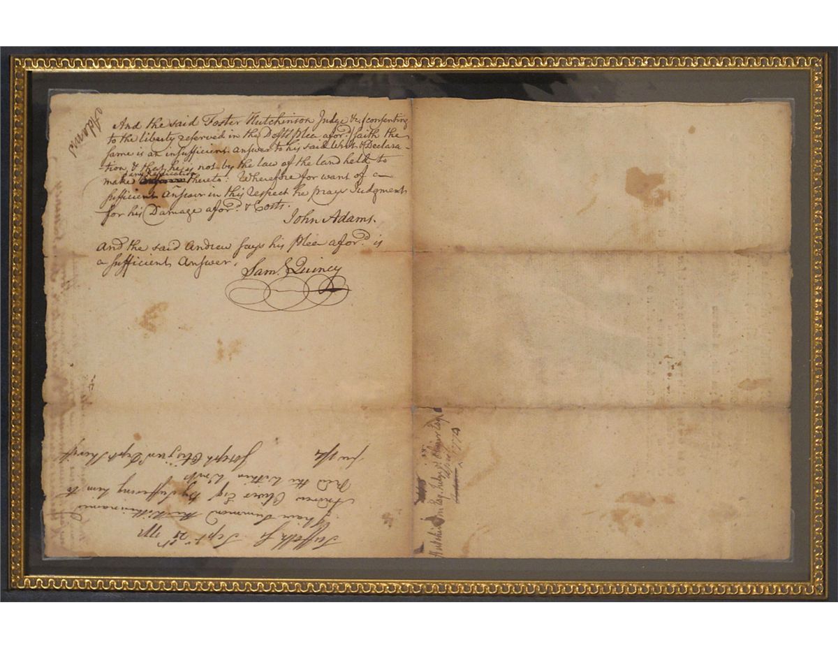 Partly-printed DS, one page both sides, 7.75 x 12.75, August 28, 1773. Notice to the Sheriffs of Suffolk and Essex County to have Andrew Oliver of Salem appear in court. In part: “In a Plea of Debt, for that said Andrews…together with Martha Allen Widow and Thomas Hubbard Esquire, since deceased, by their Bond under their hands…unto Thomas Hutchinson…in the sum of Fifteen Thousand Pounds of lawful money, to be paid to the said Thomas Hutchinson…yet the said Andrew Oliver, Martha Allen and Thomas Hubbard never paid.” On the reverse, Adams writes seven lines, beginning “And the said Foster Hutchinson Judge consenting to the liberty reserved in the Debt of Plea…the same is an insufficient answer to his said Writ & Declaration.” Signed once at the conclusion, “John Adams,” and signed a second time in the top left corner, “Adams.” Lower margin of front is also signed by well-known attorney Samuel Quincy, who had faced off against Adams just three years prior as head counsel for the prosecution in the Boston Massacre trial (Adams led the defense). Nicely matted and framed along with two commemorative plates and copies of the first page of the document and a reprinted congressional document to an overall size of 33 x 42. In very good condition, with professional repairs to several separations along folds, tiny pinholes at folds, and scattered toning. The debt being handled in this document belonged to the Honorable Andrew Oliver of Salem, a founder of the American Academy of Arts and Science and a member of the American Philosophical Society in Philadelphia. An interesting document connecting three prominent Massachusetts figures, boasting two bold Adams signatures. Oversized.