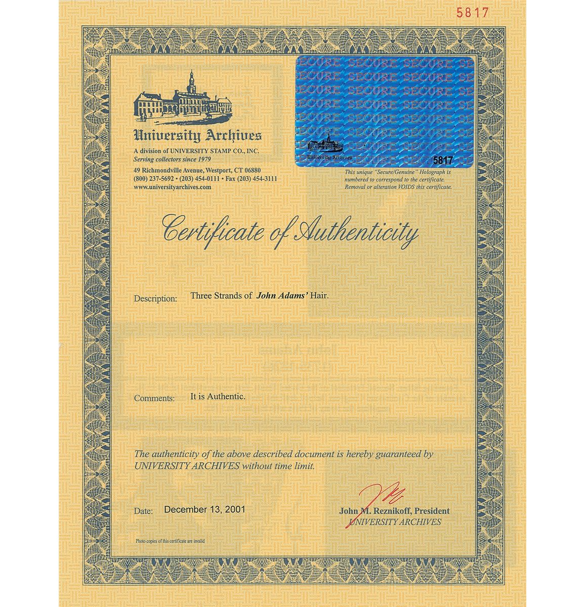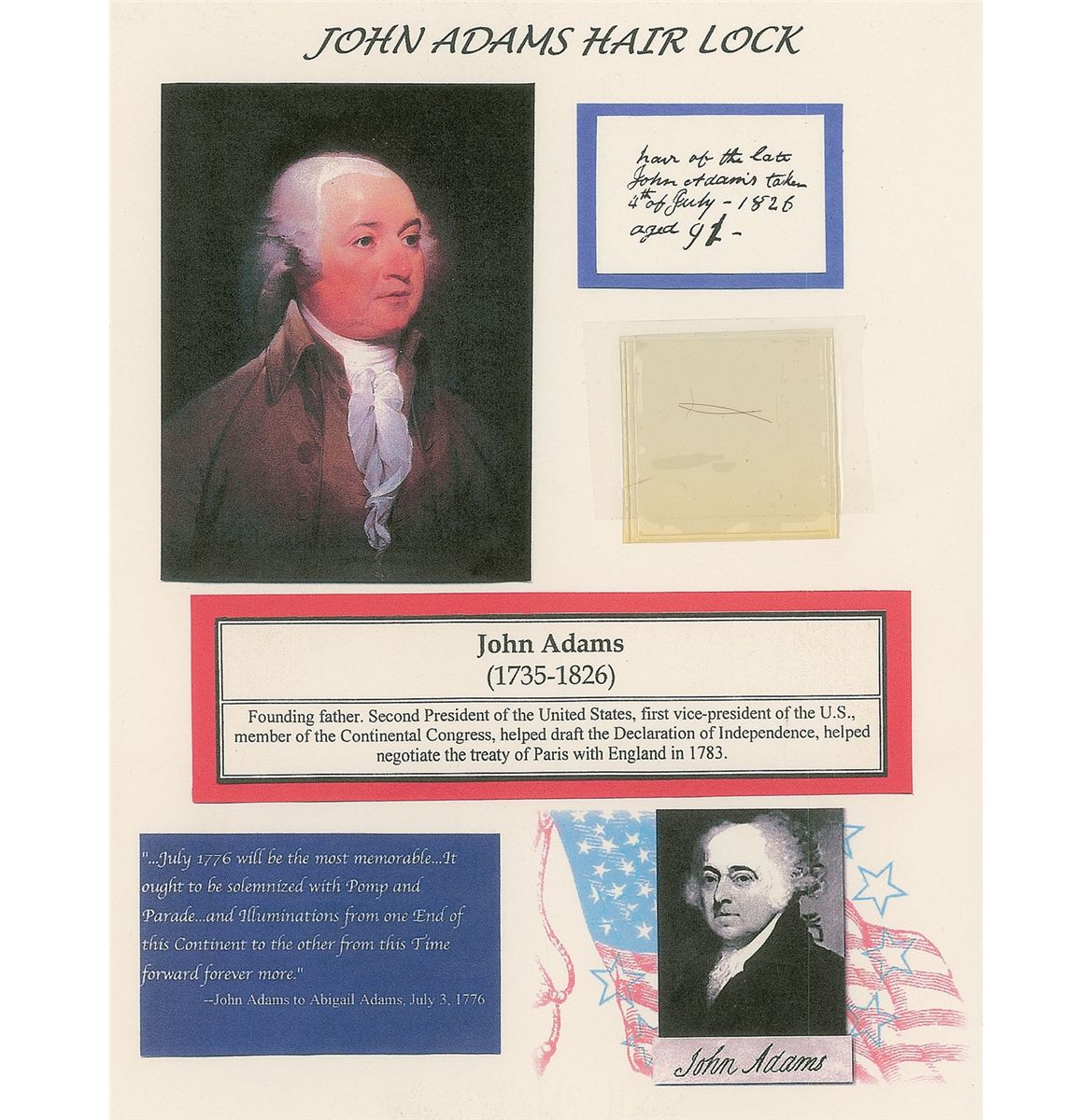 Three short strands of Adams’s hair, encapsulated in clear plastic, and affixed to an 8.5 x 11 informational sheet, which bears a copy of the original letter of provenance which reads, “hair of the late John Adams taken 4th of July—1826 aged 91.” In fine condition. Accompanied by a certificate of authenticity from University Archives’ John Reznikoff.