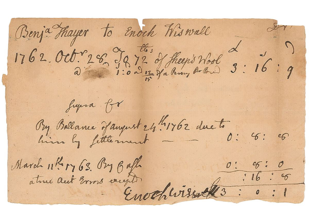 Unsigned handwritten document, one page, 6.25 x 4, dated 1862–63. Adams writes a document concerning a payment from “Benja. Thayer to Enoch Wiswall” in a transaction of “72 lbs of Sheep’s Wool” at a cost of £3.16.9. The document is entirely in Adams’s hand with the exception of Wiswall’s signature at the bottom confirming receipt of payment. In very good condition, with a partial separation to the central vertical fold, toning, and chipping to edges.