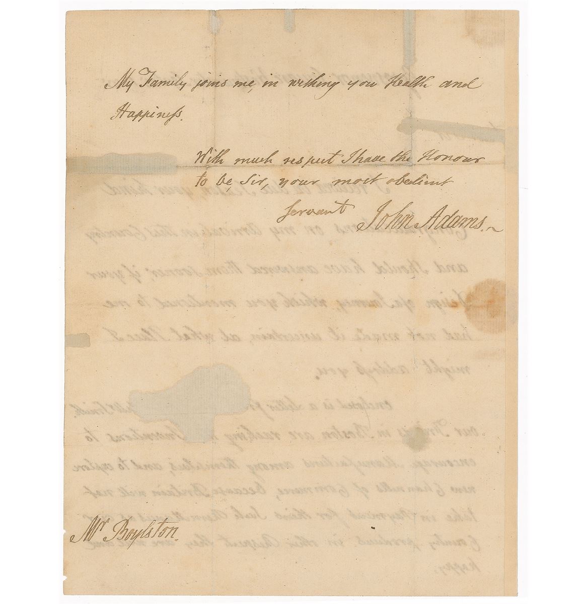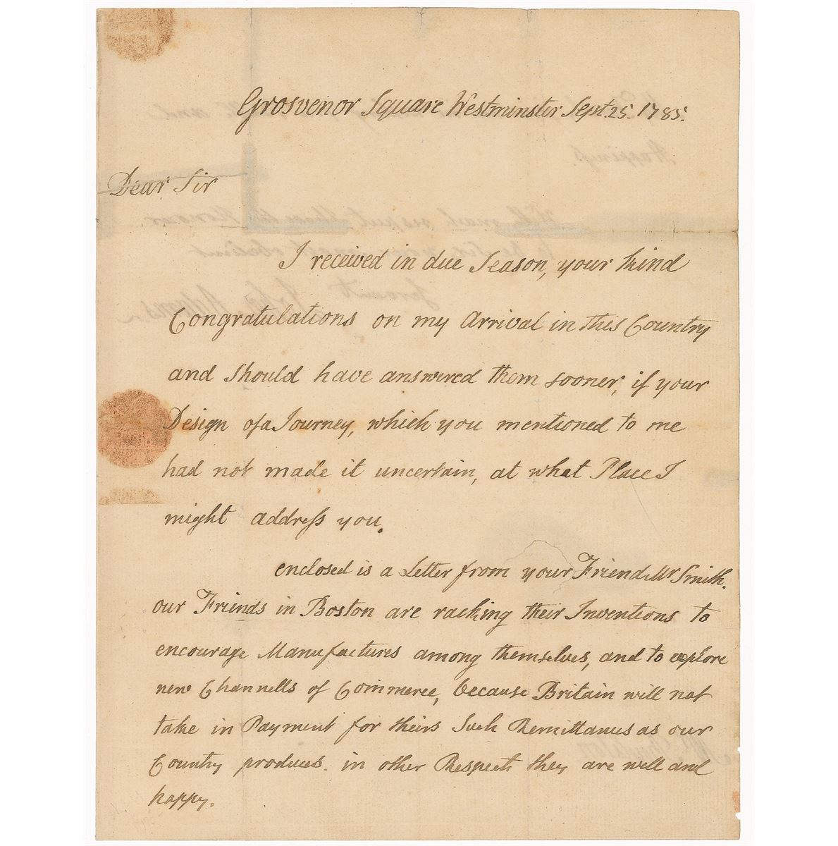 ALS, one page, 7.5 x 9.75, September 25, 1785. Letter to “Mr. Boylston.” In part: “I received in due Season, your kind Congratulations on my Arrival in this Country…Our friends in Boston are racking their Inventions to encourage Manufactures among themselves, and to explore new Channells of Commerce, because Britain will not take in Payment for theirs such Remittances as our Country produces. In other Respects they are well and happy.” In very good condition, with repaired separations to intersecting folds, one fold passing through a single letter of the signature, a few repaired tears, and circular areas of toning from seals.