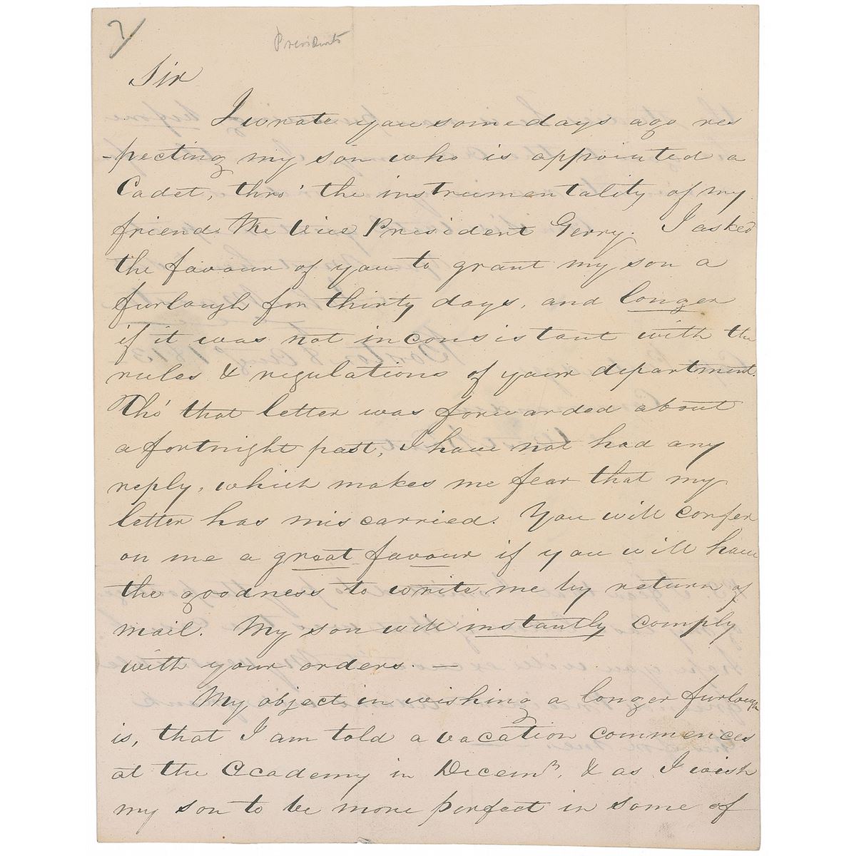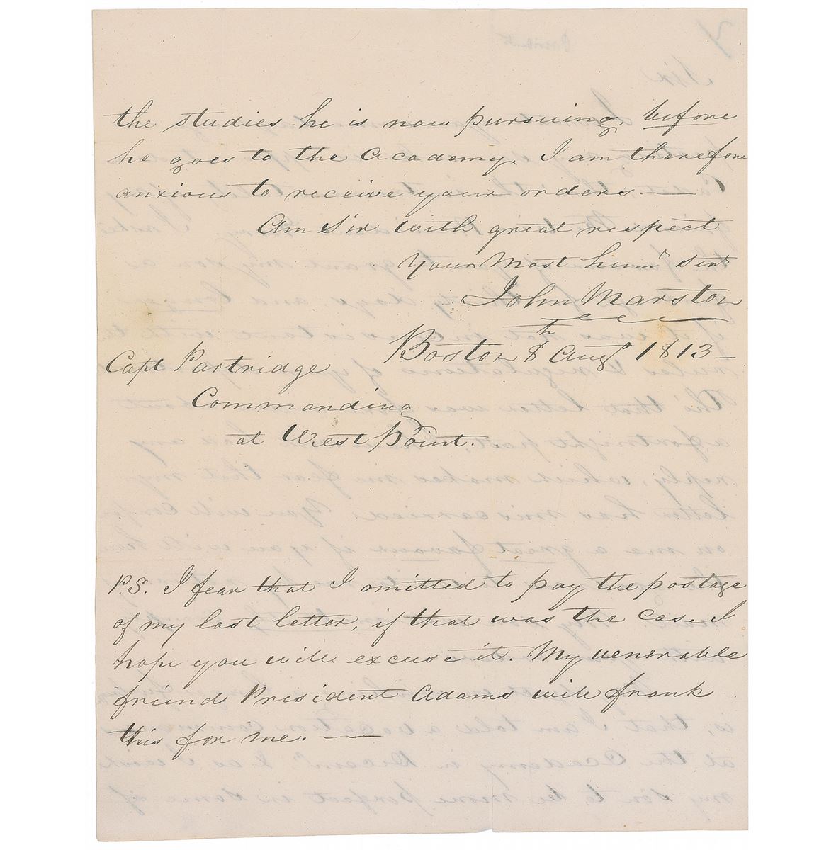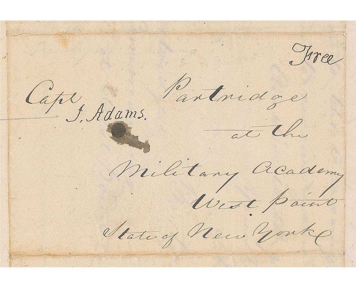 Full free frank, measuring 9.75 x 7.75 unfolded with a 5 x 3.25 center panel, addressed in another hand to “Capt Partridge at the Military Academy, West Point, State of New York,” franked in the upper right by Adams, “Free,” and signed on the left side, “J. Adams.” The original adjoining letter remains attached, written by “John Marston,” August 8, 1813, requesting a thirty day furlough for his son, Ward Marston, recently commission to be a cadet at West Point, reasoning, “I wish my son to be more perfect in some of the studies he is now pursuing, before he goes to the academy.” He writes that he had forwarded a letter through Vice President Elbridge Gerry two weeks earlier and had received no response, adding, “I fear that I omitted to pay the postage of my last letter…My venerable friend President Adams will frank this for me.” In fine condition, with intersecting folds, a few small edge tears, expected paper loss to the upper panel from seal removal, and a stray ink blot below Adams’s signature. Marston again relied on Adams in 1818, sending a letter to say that his son failed a mathematics test and was thus not promoted after four years at West Point, again hoping that Adams may intercede on his behalf. A fantastic piece revealing the relationships and patronage that informed the politics of early America.