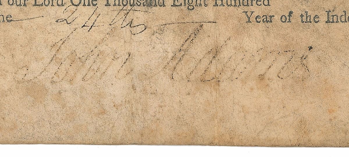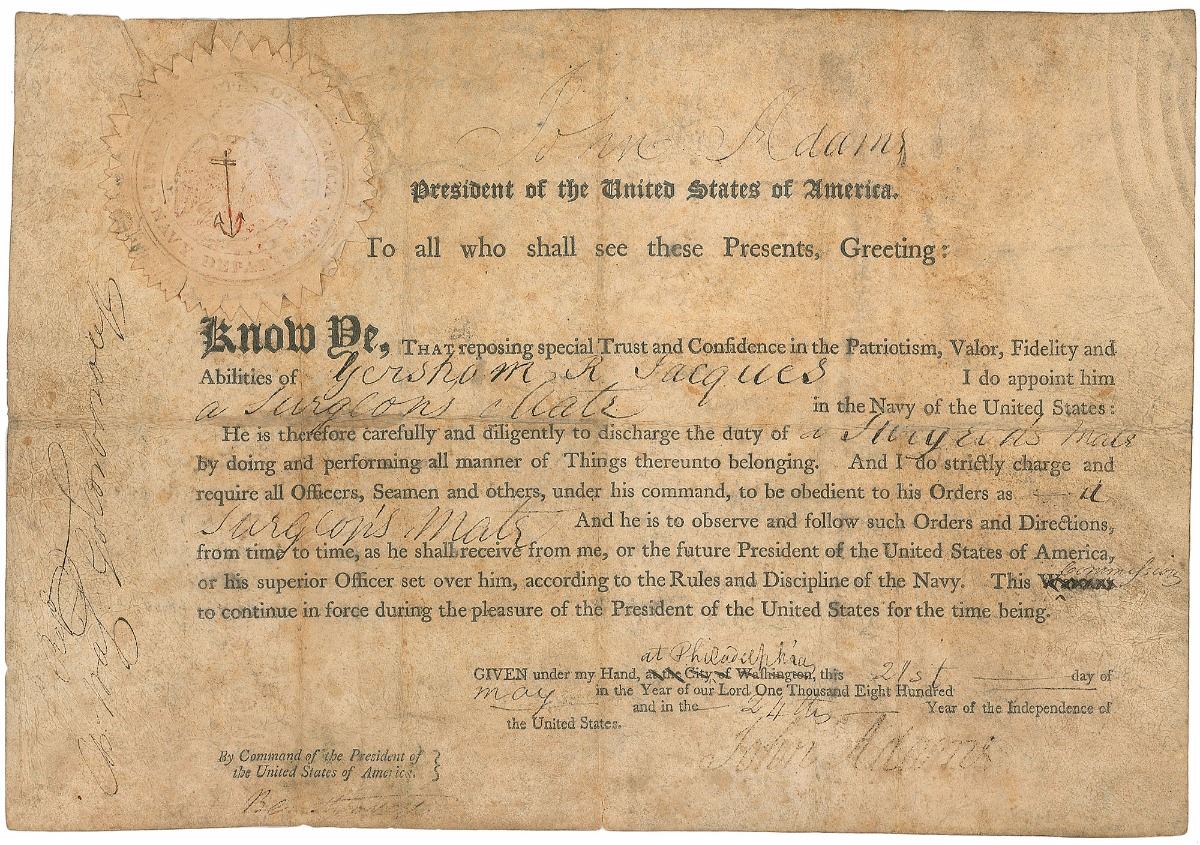 Partly-printed vellum DS as president, one page, 12 x 8.25, May 21, 1800. President Adams appoints Gersham R. Jacques as “a Surgeon’s Mate in the Navy of the United States.” Signed at the conclusion by President Adams and countersigned by Secretary of the Navy Benjamin Stoddert. The white paper seal affixed to the upper left remains intact and crisply embossed. Intersecting folds (two vertical folds passing through single letters of the signature), heavy overall soiling, and signatures very light but legible, otherwise very good condition. Soon to come was the bitter campaign for the 1800 presidential election, which placed the Democratic-Republican Adams against Federalists Thomas Jefferson and Aaron Burr. The three-fifths clause gave the southern states an advantage in the electoral vote, resulting in a Federalist victory; if the disenfranchised slaves had not counted in the appropriation of electoral votes, Adams would have won. Even more unusual, Jefferson and Burr tied in electoral votes and the House of Representatives determined the winner. Jefferson went on to promote Gersham R. Jacques to surgeon in the Navy in 1807.