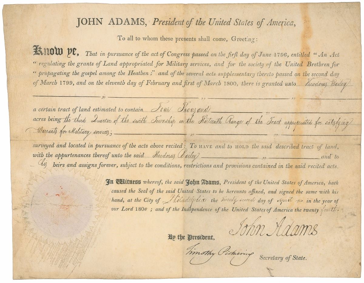 Partly-printed vellum DS as president, one page, 13 x 10.5, April 22, 1800. President Adams grants Theodorus Bailey a plot of 4,000 acres. In part: “In pursuance of the act of Congress passed on the first day of June 1796, entitled ‘An Act regulating the grants of Land appropriated for Military services, and for the society of the United Brethren for propagating the Gospel among the Heathen’…there is granted unto Theodorus Bailey a certain tract of land estimated to contain Four Thousand acres…of the tract appropriated for satisfying Warrants for Military services.” Boldly signed at the conclusion by President Adams and countersigned by Secretary of State Timothy Pickering. The white paper seal affixed to the lower left remains intact with a horizontal crack. Intersecting folds, scattered soiling, and a vertical band of staining to the right side, otherwise fine condition; the signature area itself is extremely clean and bright. This type of land grant was typically issued as compensation for military service during the Revolutionary War. Presidential documents by Adams are quite scarce, and infrequently found with such a strong signature.