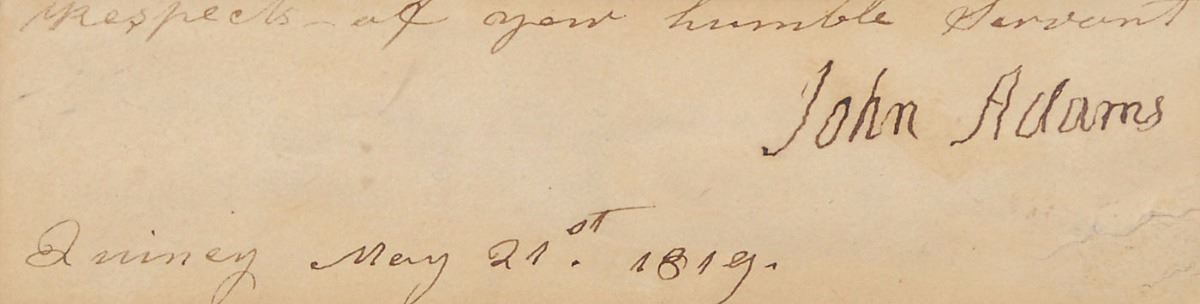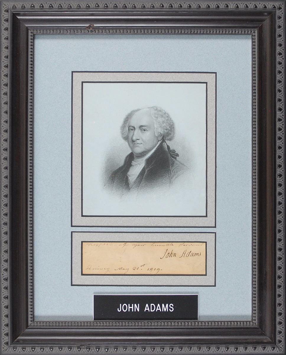 Crisp ink signature, "John Adams," on an off-white 4.5 x 1 slip clipped from the close of a letter, dated May 21, 1819. Double-matted and framed with an engraved portrait and nameplate affixed to the glass to an overall size of 10.75 x 13.25. In fine condition, with overall toning and a small tear to the lower right. A choice, crisp signature of the scarce Founding Father.