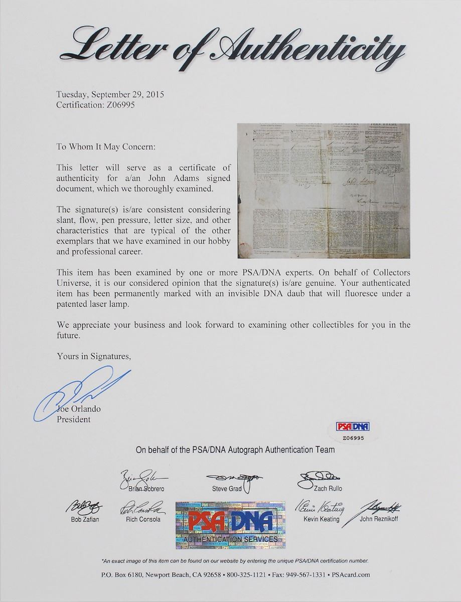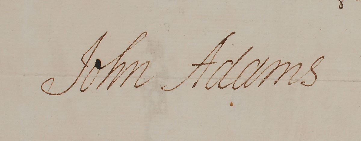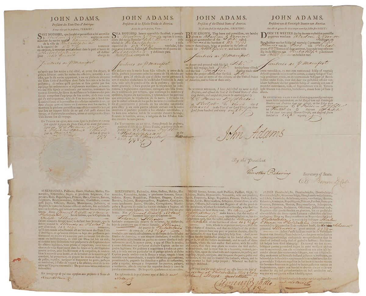 Partly-printed DS as president, one page, 19 x 15.5, March 3, 1798. Four-language ship’s papers issued to “Absalom Z. Vernon master of commander of the Sch called Illinois…bound for Petit Goave and laden with Sundries as p. Manifest.” Prominently signed in the center by President Adams and countersigned by Secretary of State Timothy Pickering. The two white paper seals affixed to the left side remain mostly intact. Removably encapsulated in a mylar sleeve. In very good condition, with repaired separations to intersecting folds, a horizontal fold passing through the lower portion of Adams’s signature, a mild stain trivially affecting the last letter of Adams’s first name, and some toning and chipping to edges. Accompanied by a full letter of authenticity from PSA/DNA. A scarce and sought-after format, particularly with such a large, bold signature.