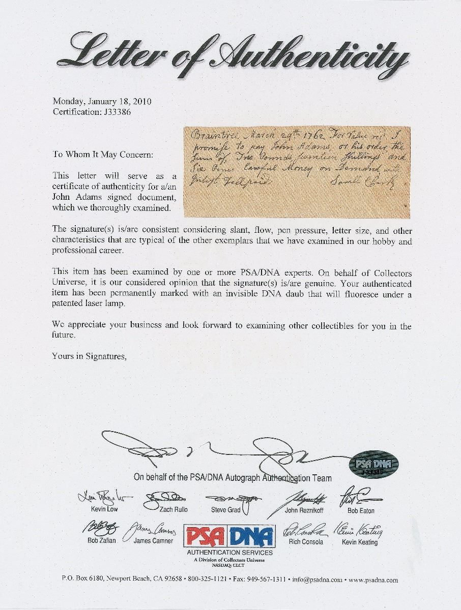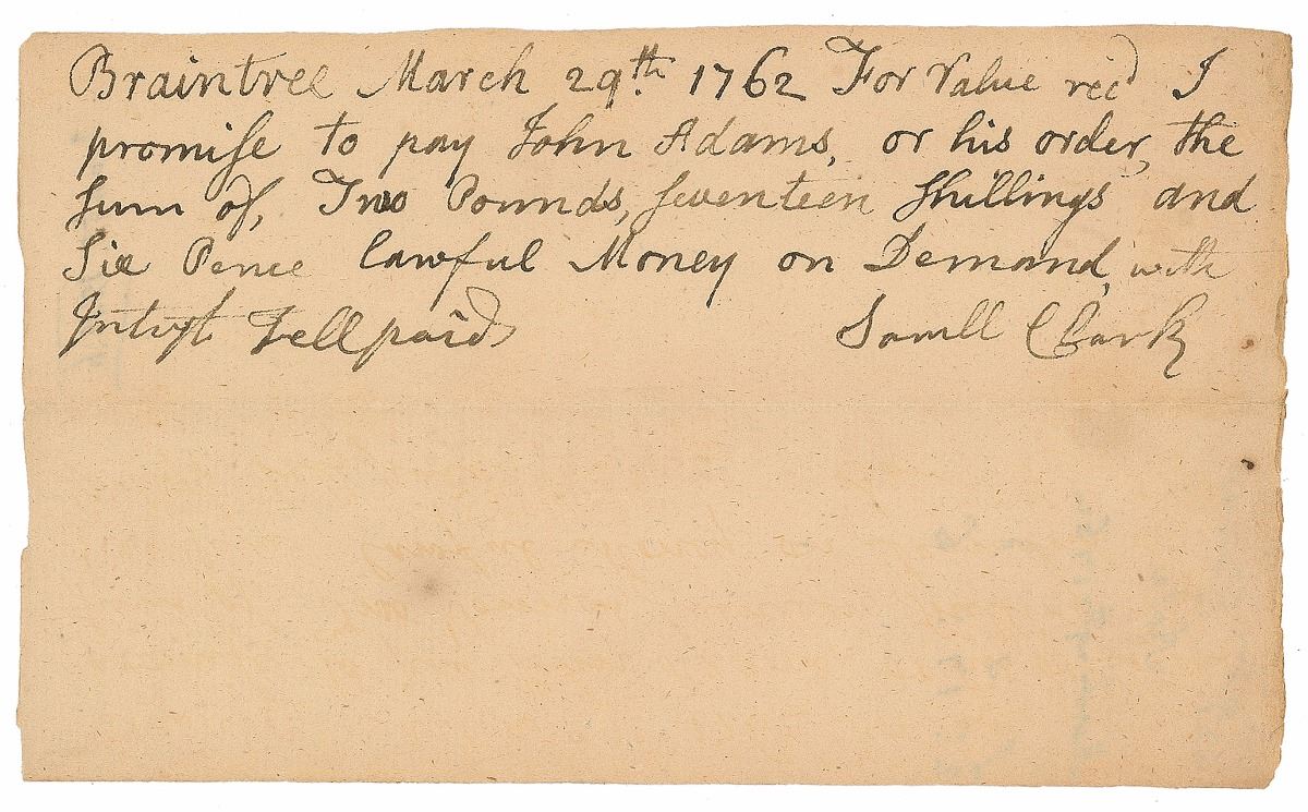 Third person ADS, one page, 6.25 x 3.75, Braintree, Massachusetts, March 29, 1762. In full: “For value rec’d I promise to pay John Adams, or his order, the sum of Two pounds, seventeen shillings and Six Pence lawful money on demand with interest well paid.” Also signed at the conclusion by the issuer, Samuel Clark. In fine condition, with scattered mild toning and a horizontal fold. Accompanied by an engraved portrait of Adams bearing a facsimile signature and a full letter of authenticity from PSA/DNA.