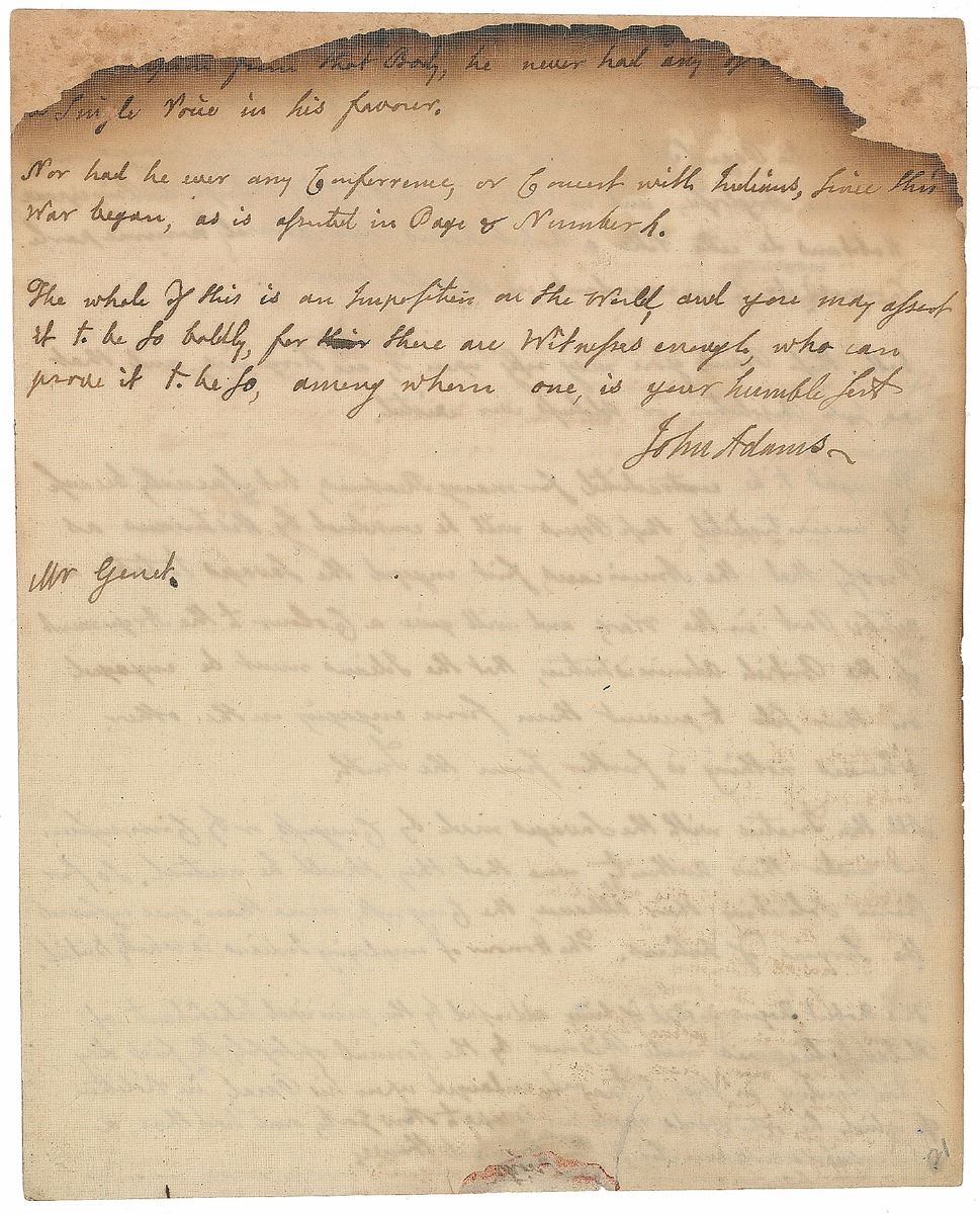 Revolutionary War–dated ALS, one page both sides, 7 x 8.75, [July 17, 1778 per Adams’s papers]. Letter to Edme-Jacques Genet. In part: “Both these papers, you may rely upon it, are forgeries, and that no such resolution or address ever existed.