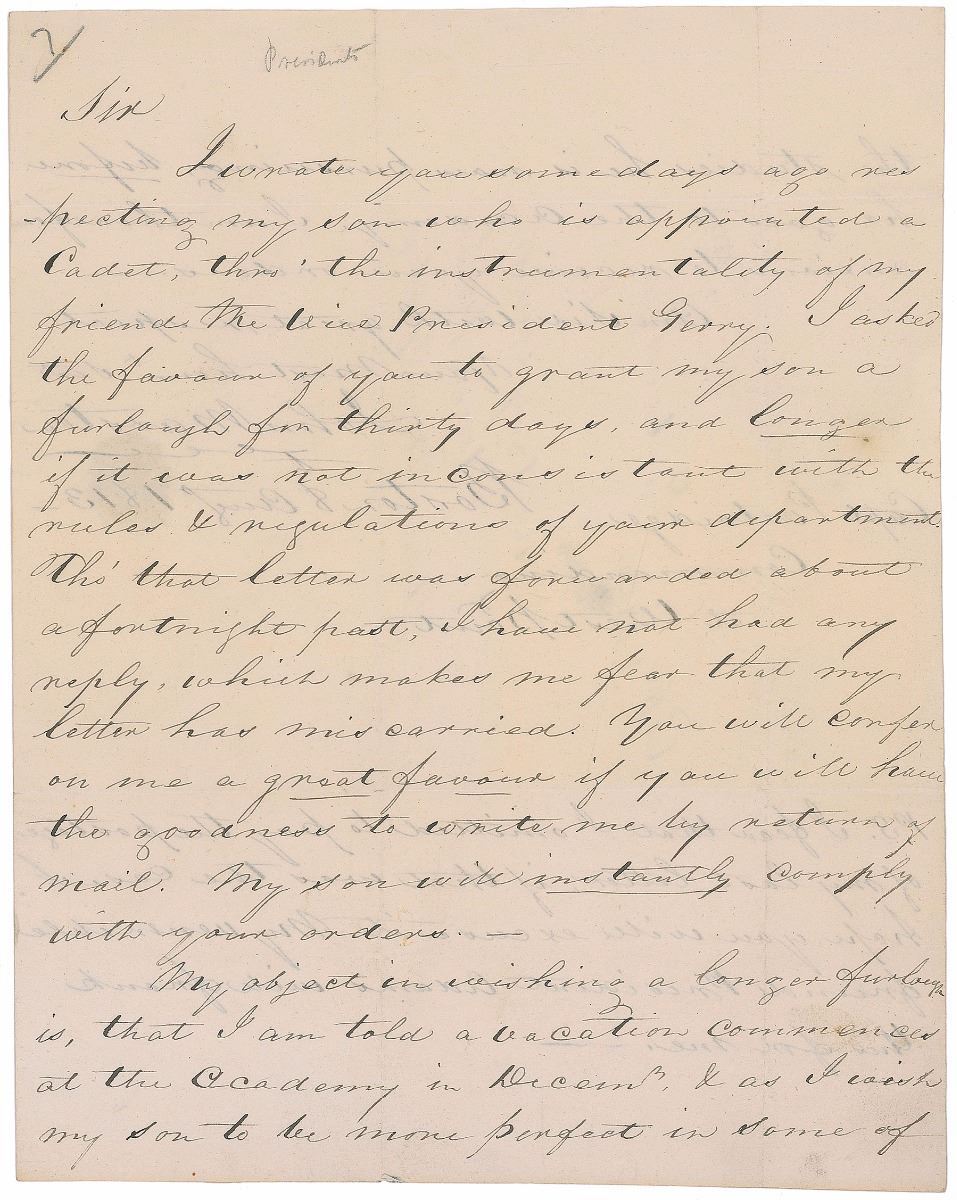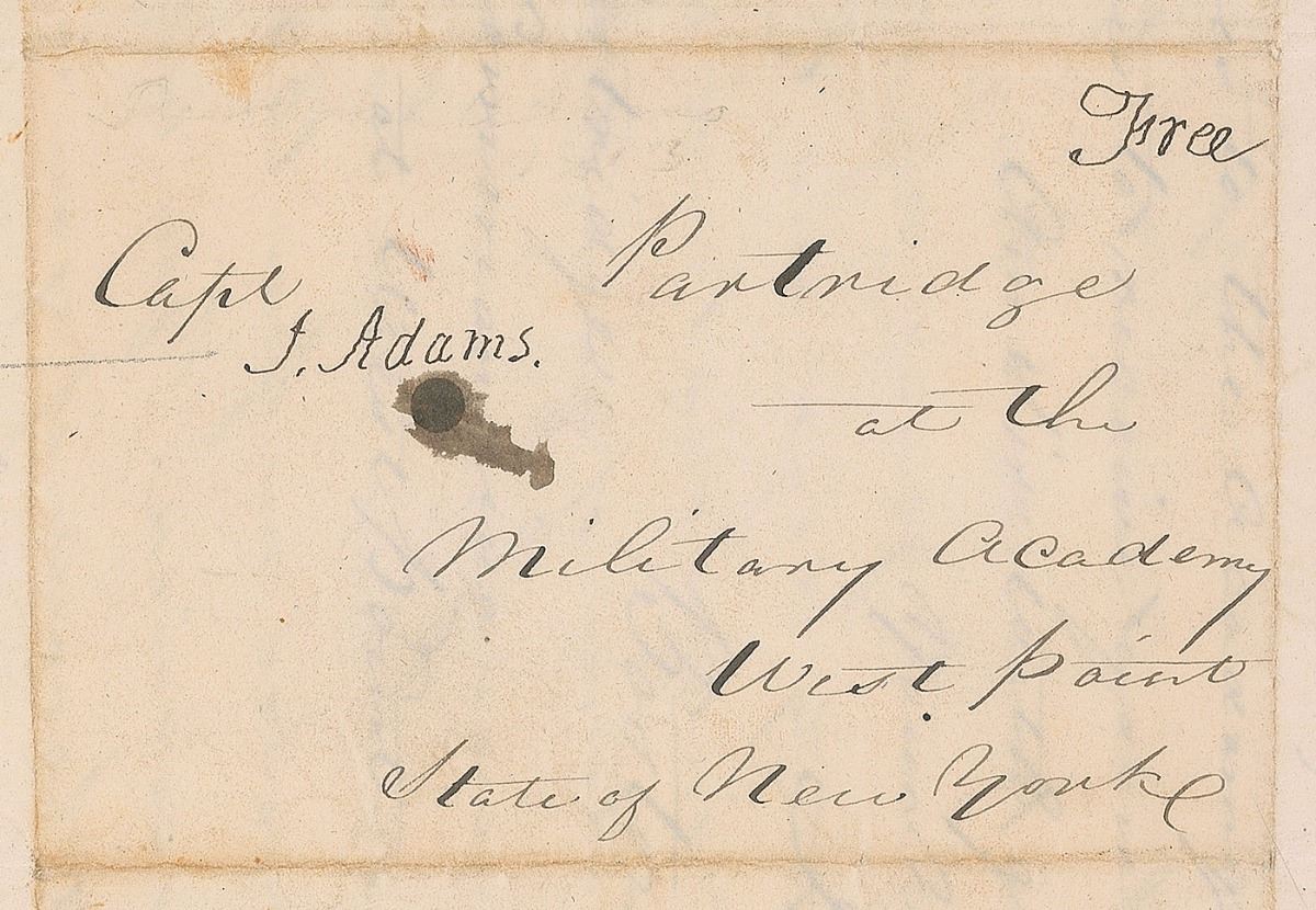 Full free frank, measuring 9.75 x 7.75 unfolded with a 5 x 3.25 center panel, addressed in another hand to “Capt Partridge at the Military Academy, West Point, State of New York,” franked in the upper right by Adams, “Free,” and signed on the left side, “J. Adams.” The original adjoining letter remains attached, written by “John Marston,” August 8, 1813, requesting a thirty day furlough for his son, Ward Marston, recently commission to be a cadet at West Point, reasoning, “I wish my son to be more perfect in some of the studies he is now pursuing, before he goes to the academy.” He writes that he had forwarded a letter through Vice President Elbridge Gerry two weeks earlier and had received no response, adding, “I fear that I omitted to pay the postage of my last letter…My venerable friend President Adams will frank this for me.” In fine condition, with seal-related paper loss on the integral address sheet. Marston again relied on Adams in 1818, sending a letter to say that his son failed a mathematics test and was thus not promoted after four years at West Point, again hoping that Adams may intercede on his behalf. A fantastic piece revealing the relationships and patronage that informed the politics of early America.