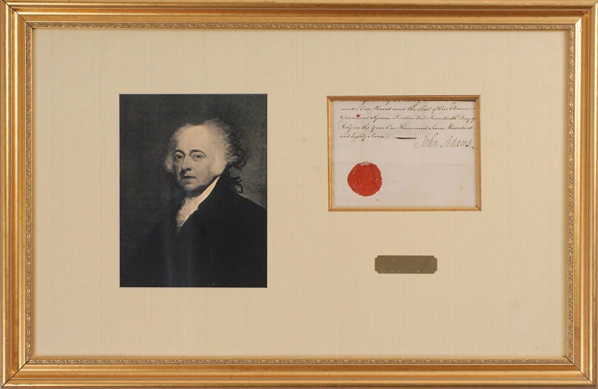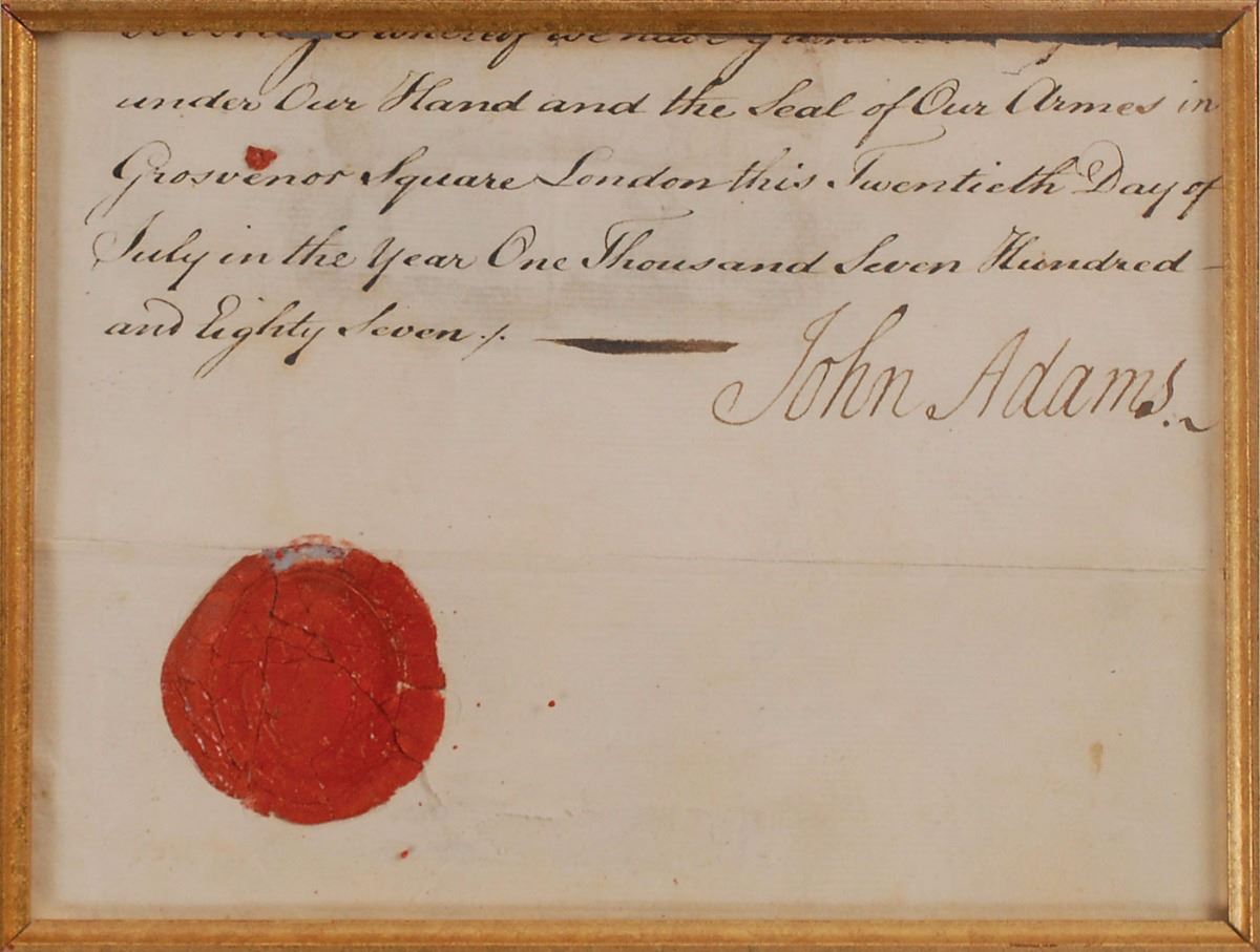 Partial manuscript DS, signed “John Adams,” one page, 7 x 5, July 20, 1787. Conclusion of a document crisply signed at the conclusion by Adams at Grosvenor Square, London, while serving as US minister to the Court of St. James's. Document retains the red wax seal affixed to the lower left. Handsomely cloth-matted and framed with a portrait and nameplate to an overall size of 28.5 x 18.5. Signature itself in very fine condition; document in very good condition with partial separations to lower fold, tear to bottom edge, and show-through from mounting remnants to reverse.