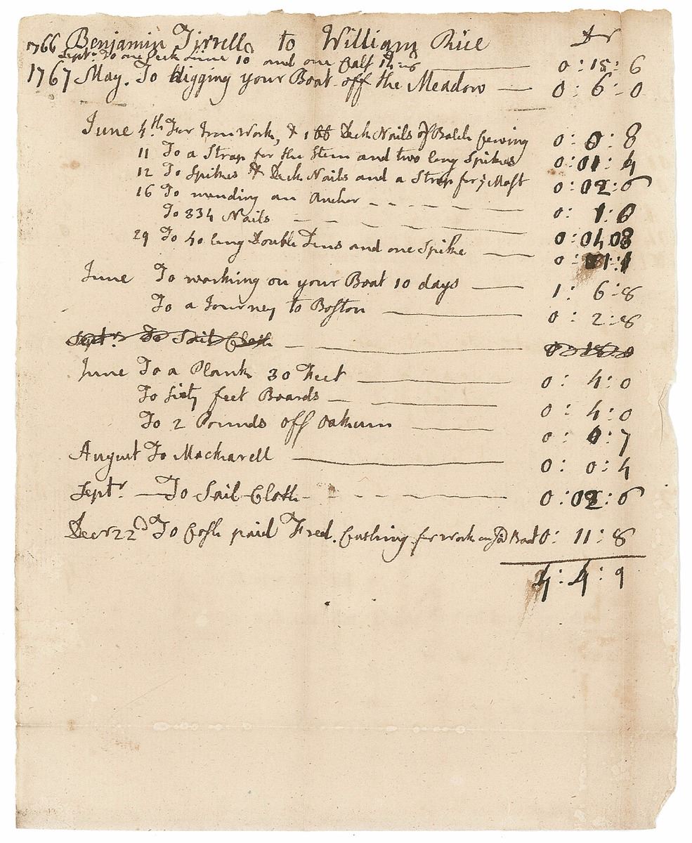 Unsigned handwritten document, one page, 6 x 7.5, 1767. An itemized bill for work done by Benjamin Tirrillo on a boat belonging to William Price, penned entirely in Adams’s hand. He writes out sixteen lines of expenses incurred by Tirrillo, including “To a strap for the Stern and two long spikes,” “To Spikes & Deck Nails and a strap for mast,” “To working on your boat 10 days,” “To a journey to Boston,” and “To sixty feet Boards.” Adams adds up the figures for a total owed of £4.4.9. In fine condition, with tiny edge separations to vertical folds. By this time Adams was established as a well-respected lawyer in Boston and had recently emerged on the political stage as a leader of the opposition to the Stamp Act of 1765. A desirable, lengthy example from this sought-after founding father.