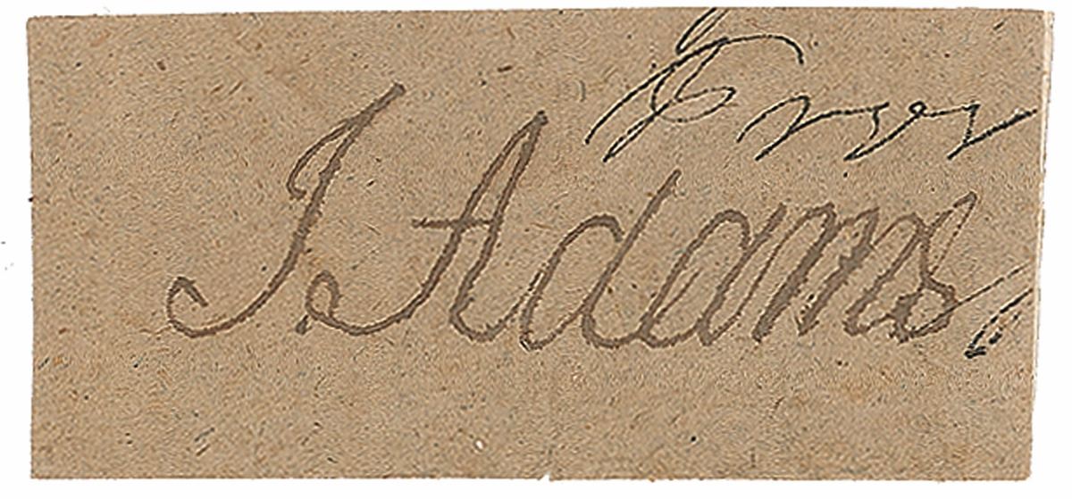 Superb ink signature, “J. Adams,” on an off-white 2.25 x 1.25 clipped slip, apparently from a free frank as “Free” is penned above in another hand. In fine condition, with a mounting remnant along one back edge. An impressively large exemplar.