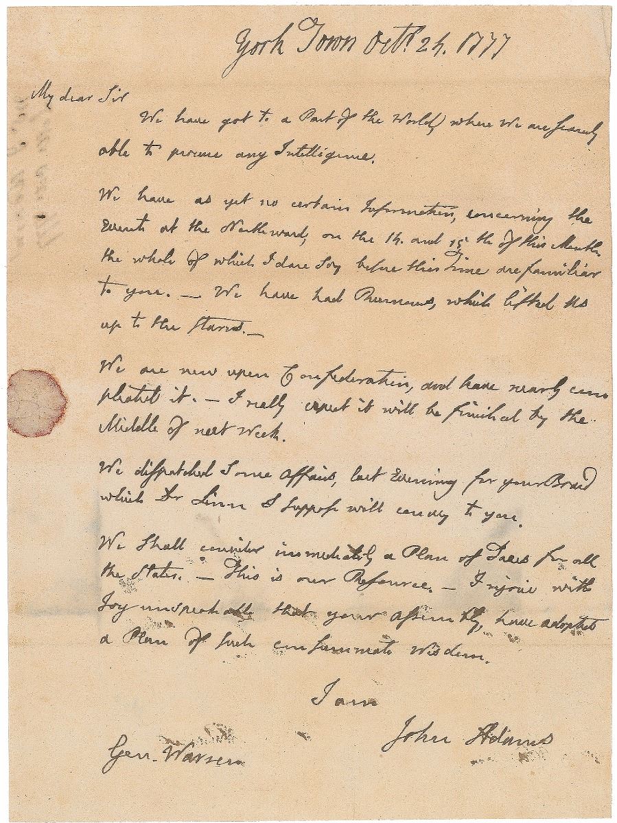 Revolutionary War–dated ALS, one page, 7 x 9.5, October 24, 1777. Letter to General James Warren, written from Yorktown. In full: “We have got to a Part of the World, where We are scarcely able to procure any Intelligence. We have as yet no certain Information, concerning the events at the Northward, on the 14. and 15th. of this Month, the whole of which I dare say before this Time are familiar to you.—We have had Rumours, which lifted us up to the Stars.—We are now upon Confederation, and have nearly compleated it.—I really expect it will be finished by the Middle of next Week. We dispatched some Affairs, last Evening for your Board which Dr. Linn I suppose will convey to you. We shall consider immediately a Plan of Taxes for all the States.—This is our Resource.—I rejoice with Joy unspeakable that your Assembly, have adopted a Plan of such consummate Wisdom.” In fine condition. This letter is published in the Warren-Adams Letters, a collection of correspondence between John Adams, Samuel Adams, and James Warren.