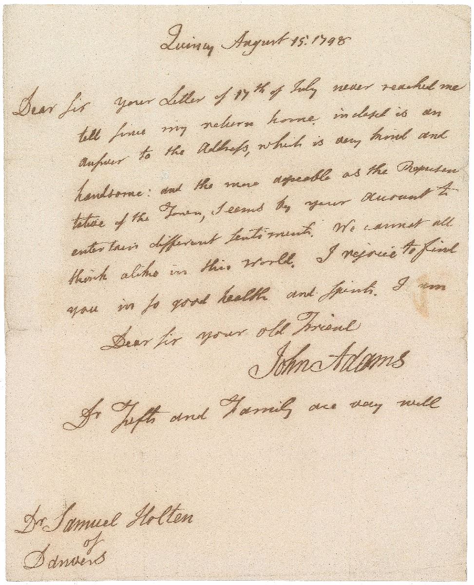 ALS as president, one page, 8 x 10, August 15, 1798. Letter to Dr. Samuel Holten of Danvers. In full: “Your letter of 17th of July never reached me till since my return home inclosed is an answer to the address, which is very kind and handsome: and the more agreeable as the Representative of the Town, seems by your account to entertain different sentiments. We cannot all think alike in this world. I rejoice to find you in so good health and spirits.” In a postscript he adds, “Dr. Tufts and Family are very well.” Silked on the reverse and in fine condition, with expert repairs to small areas of paper loss.